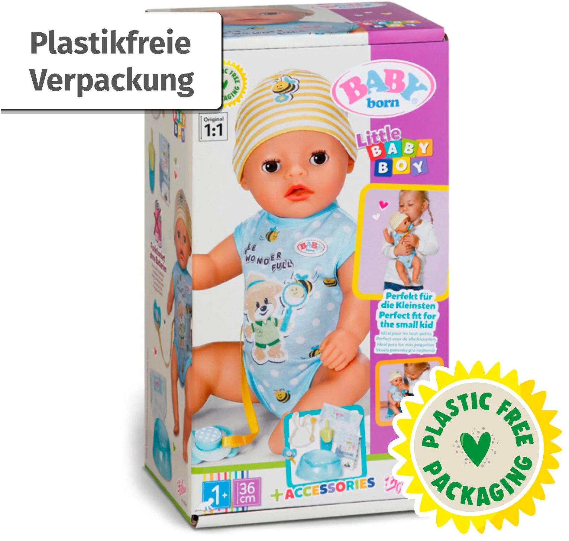 Der BABY BORN Little Baby Boy ist die ideale erste Babypuppe für Kleinkinder ab 12 Monaten. Mit seiner handlichen Größe von 36 cm und einem leichten Gewicht lässt er sich wunderbar tragen, füttern, baden und ins Bettchen legen. Seine 7 Funktionen funktionieren komplett ohne Batterien und machen das Rollenspiel besonders realistisch und kindgerecht.