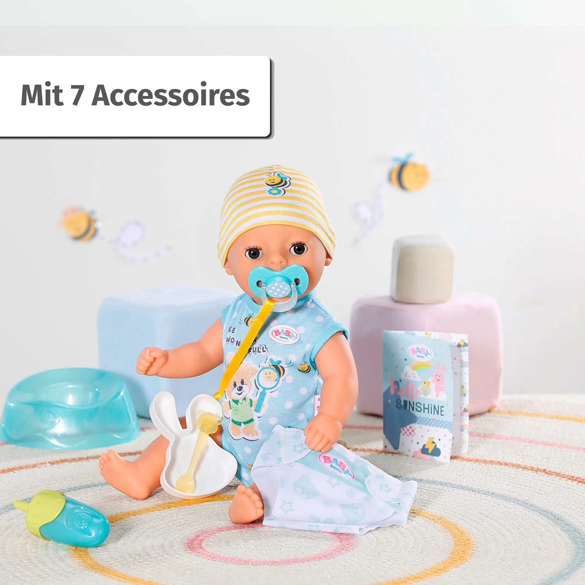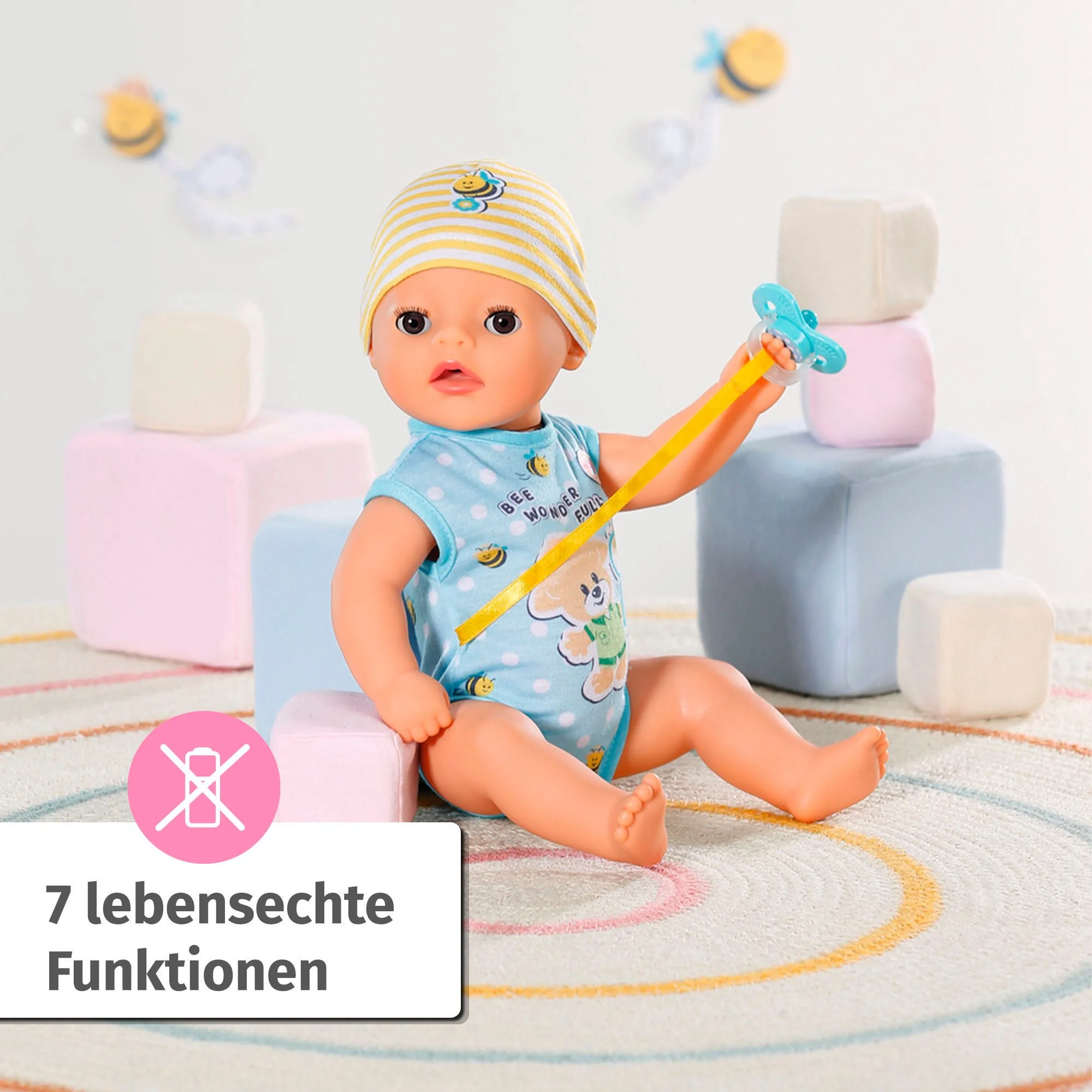 | Funktionen | Trinken · In die Windel machen · Aufs Töpfchen gehen · Schlafen · Augen öffnen & schließen per Magic-Schnuller · Bewegliche Arme & Beine · Baden möglich |