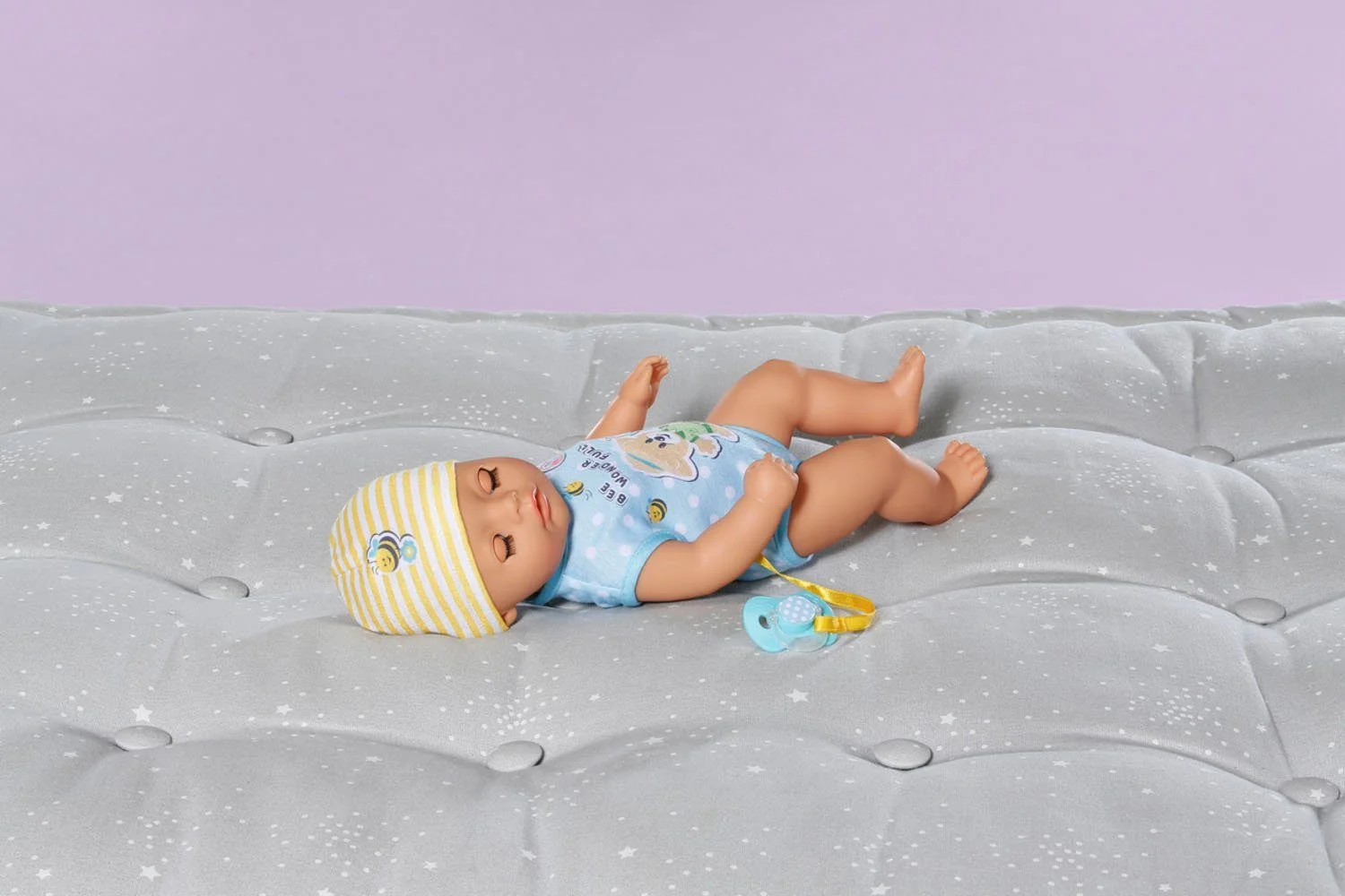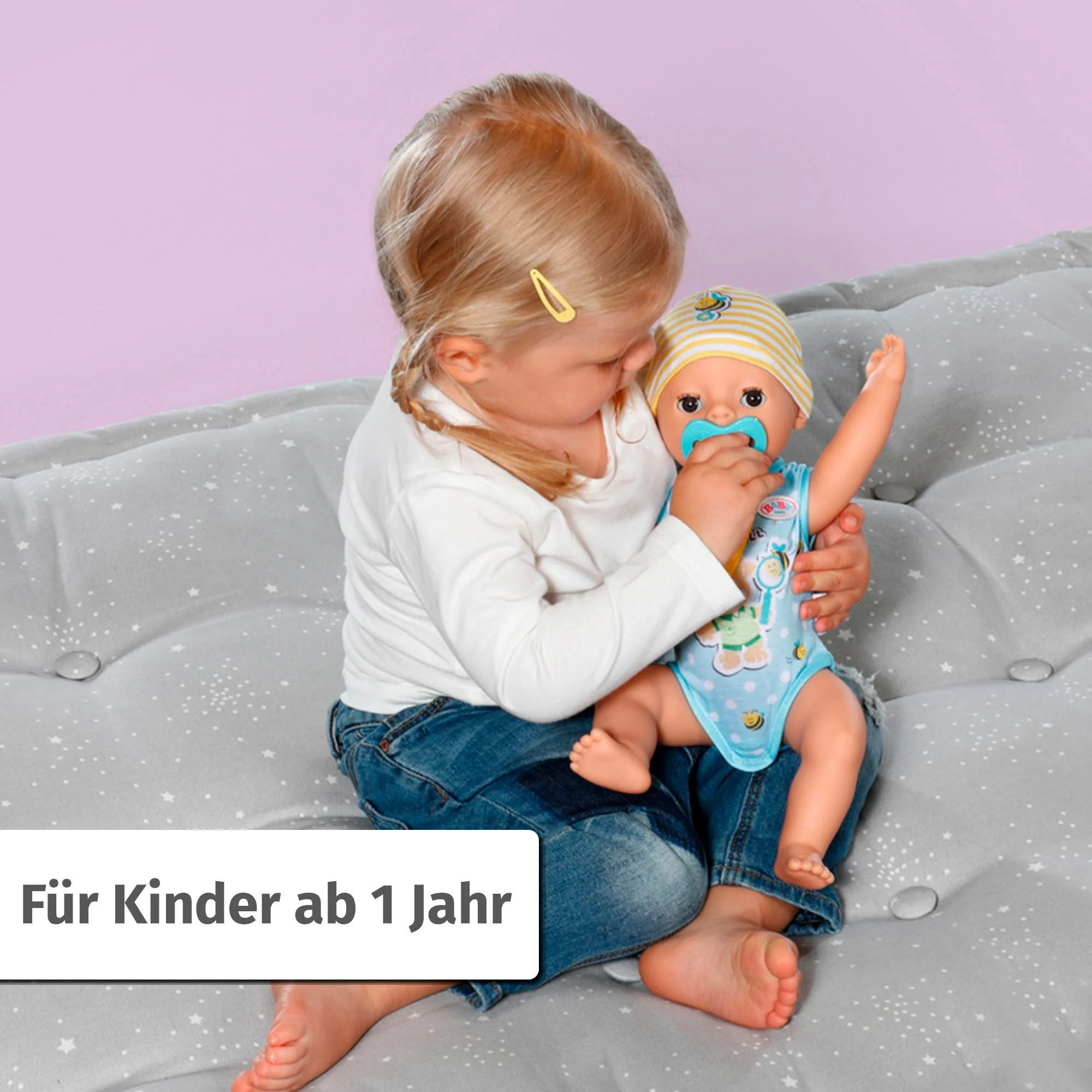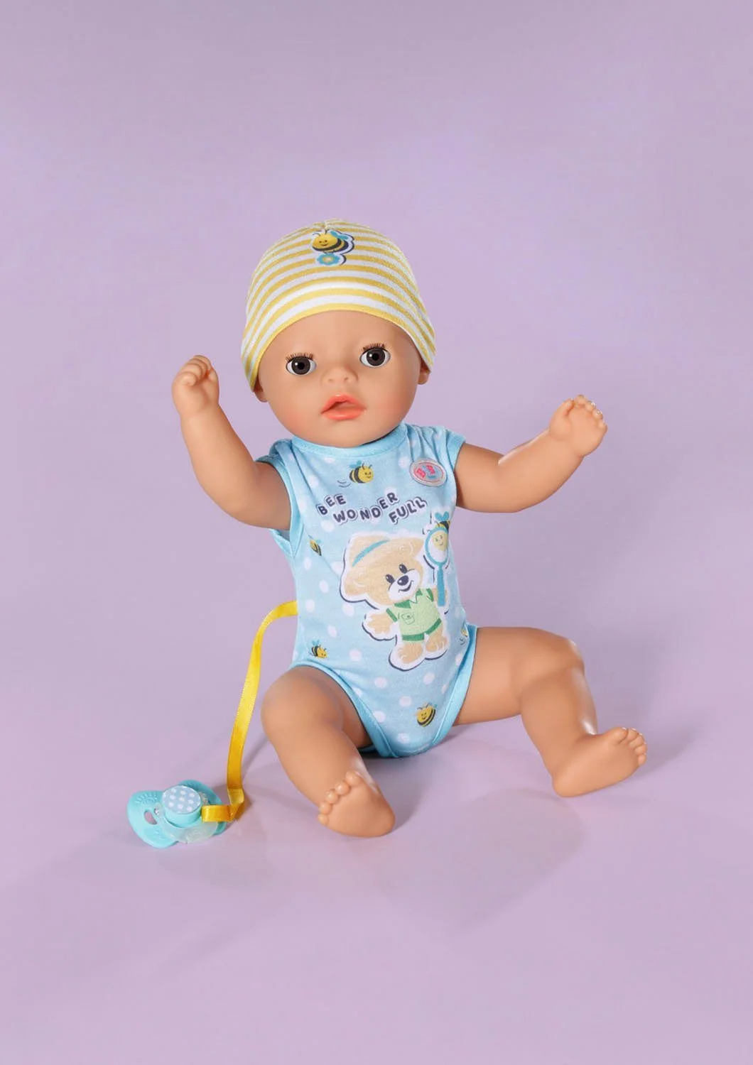 Er kann aus seinem Fläschchen trinken, in die Stoffwindel machen oder aufs Töpfchen gehen. Sein magischer Schnuller sorgt dafür, dass er – egal ob sitzend oder liegend – auf zauberhafte Weise die Augen öffnet oder schließt. Auch ohne Schnuller fallen die Augen beim Schlafen sanft zu. Bewegliche Arme, Beine und Kopf erleichtern kleinen Kinderhänden das An- und Ausziehen.