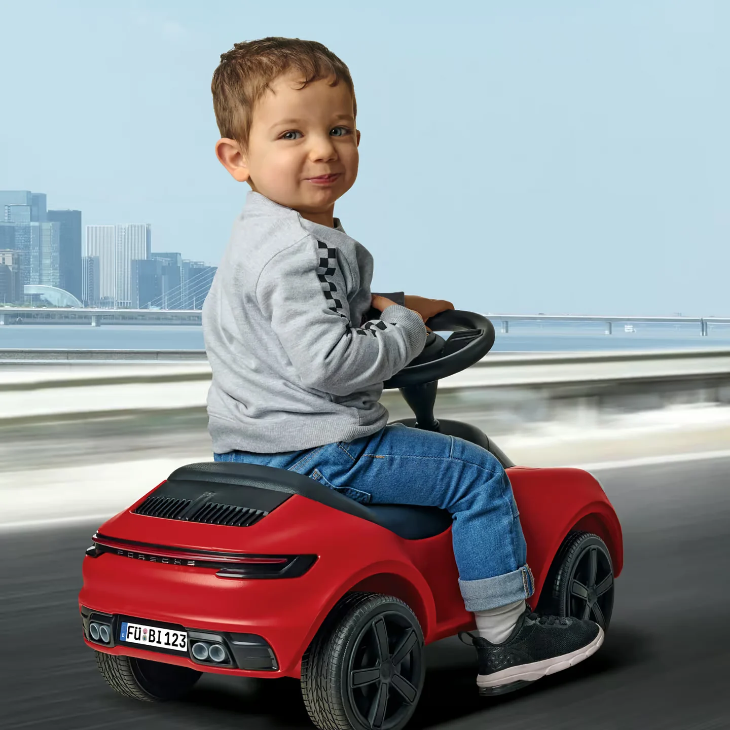 Highlights: ikonisches Porsche-Design, leise Flüsterräder, hochwertige Sitzfläche, realistische Lichtdetails, mechanische Hupe mit Porsche Wappen, besonders robuste Karosserie.