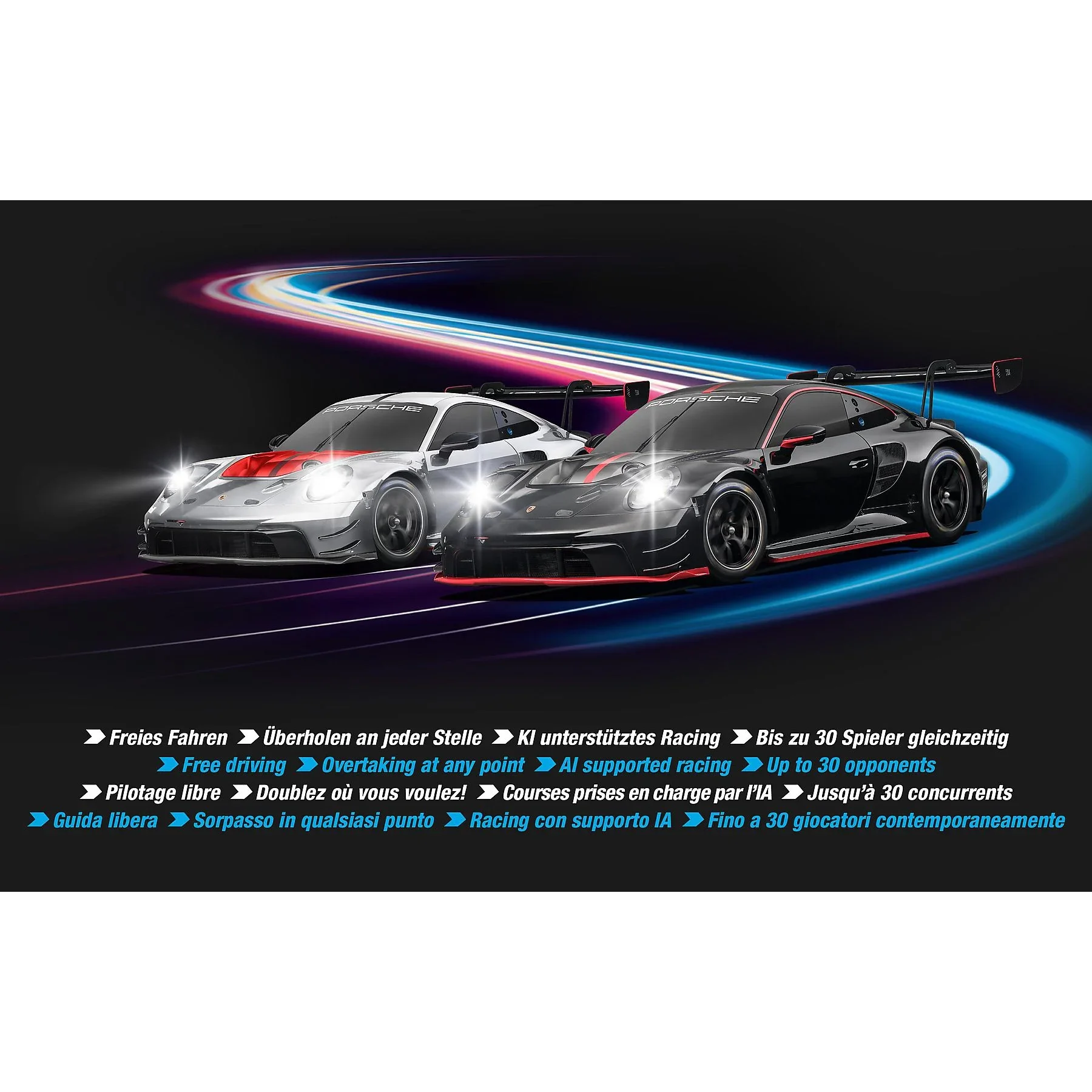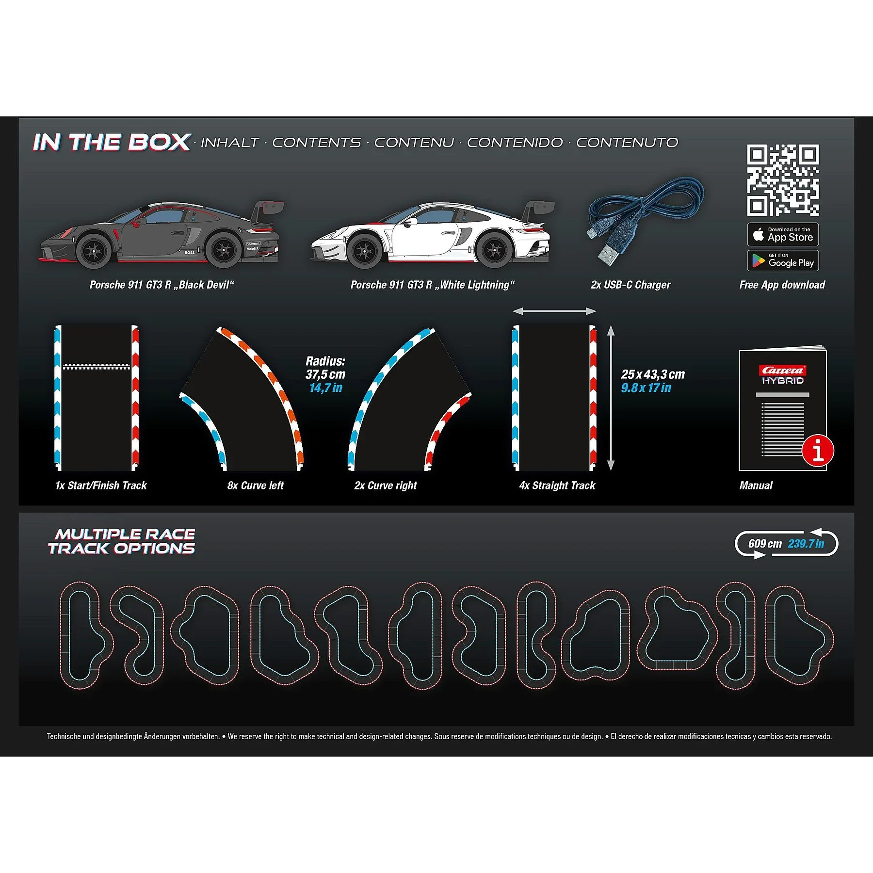 • Porsche 911 GT3 R „Black Devil“ • Porsche 911 GT3 R „White Lightning“ • Start-/Zielgerade • 4 gerade Schienen • 2 rechte + 8 linke Kurvenelemente • 2× USB-C Ladekabel • Eingebaute Li-Po Akkus in beiden Fahrzeugen |