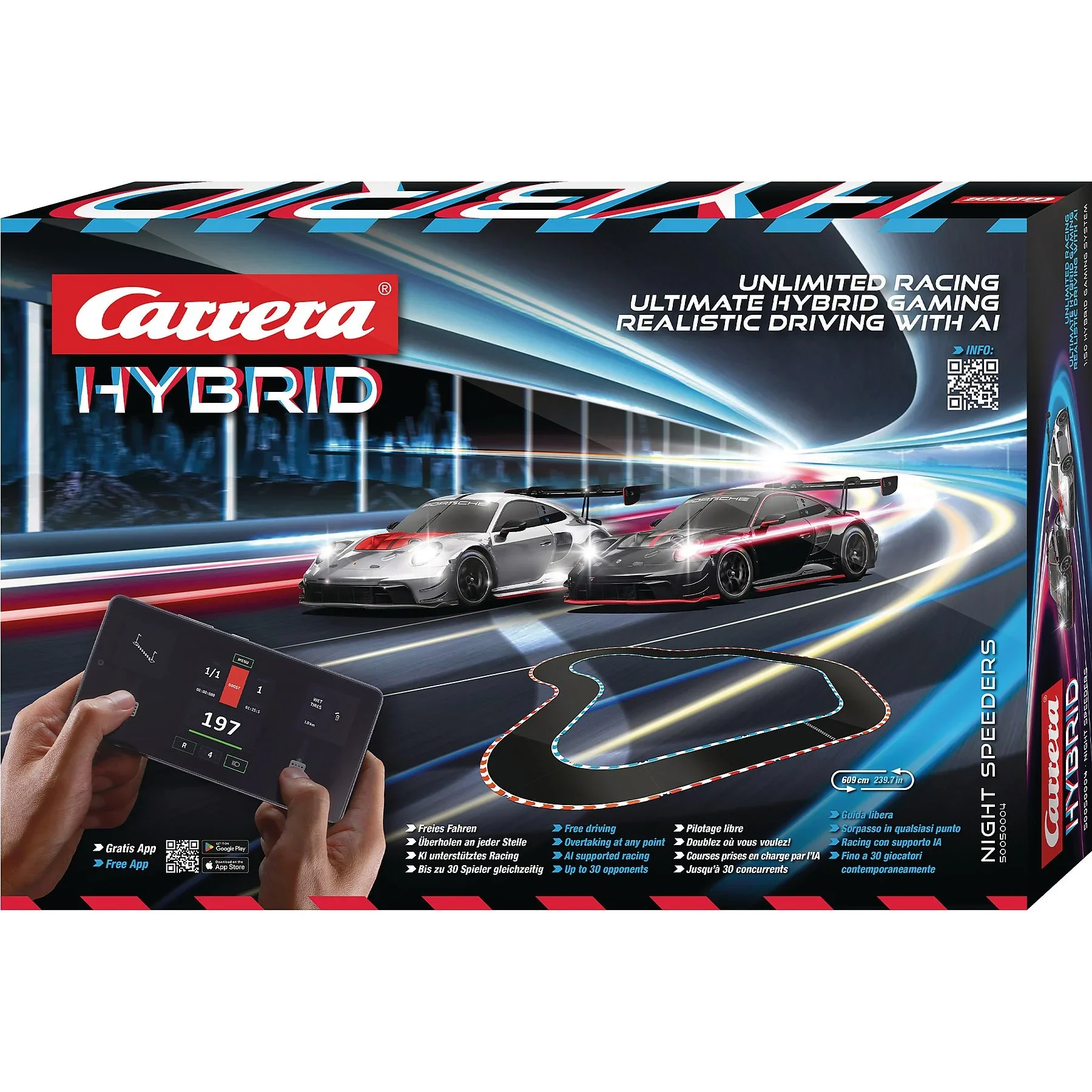 Das Carrera Hybrid Racing Set „Night Speeders“ verbindet digitales Racing mit klassischem Rennbahnspaß. Extra breite 1:50-Schienen, spurfreies Überholen an jeder Stelle der Strecke und die Möglichkeit, bis zu 30 Fahrer gegeneinander antreten zu lassen, machen dieses Set zu einem echten Highlight für Rennfans.