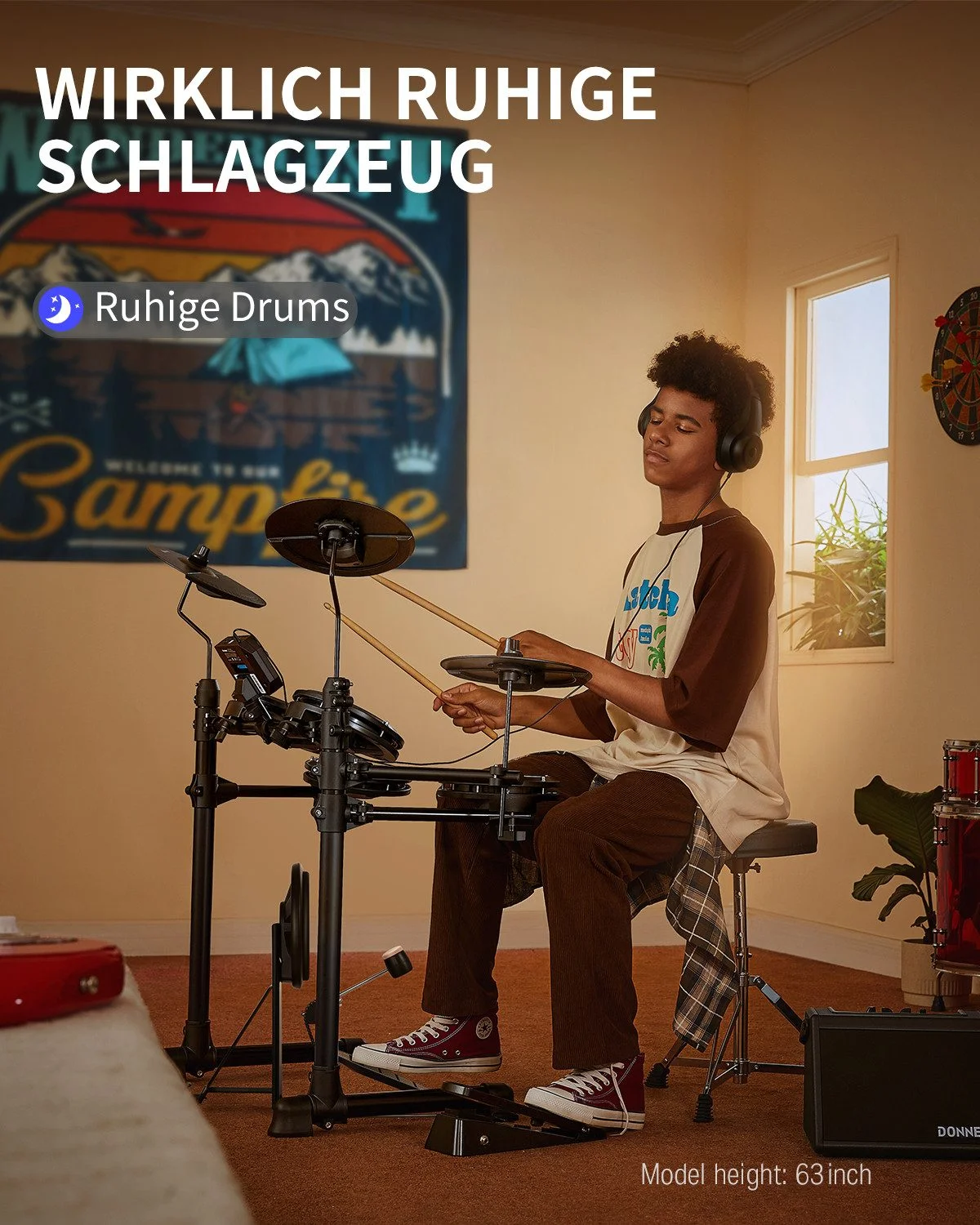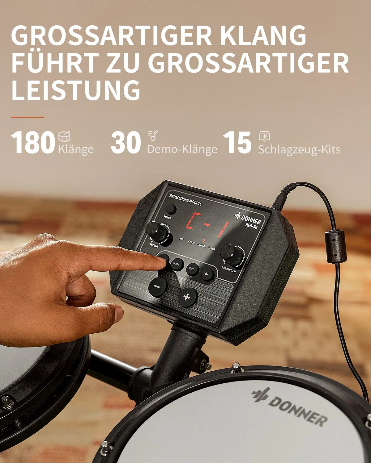 Das Donner DED-80 ist ein kompaktes, leises und einsteigerfreundliches E-Drum-Set, ideal für Wohnungen, Jugendliche und erwachsene Anfänger. Dank seiner doppellagigen Mesh-Felle, umfangreichen Lernfunktionen und der Möglichkeit, per Kopfhörer nahezu geräuschlos zu üben, bietet das Set ein realistisches, komfortables und zugleich nachbarschaftsfreundliches Schlagzeugerlebnis.