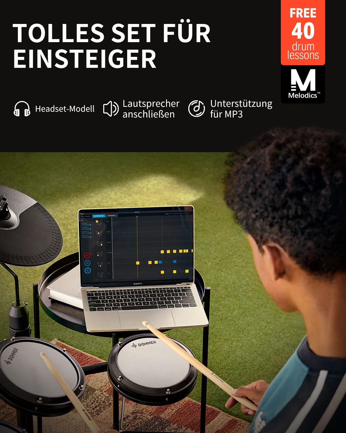 - Komplettes Set inkl. Drumhocker, Kopfhörer & Sticks