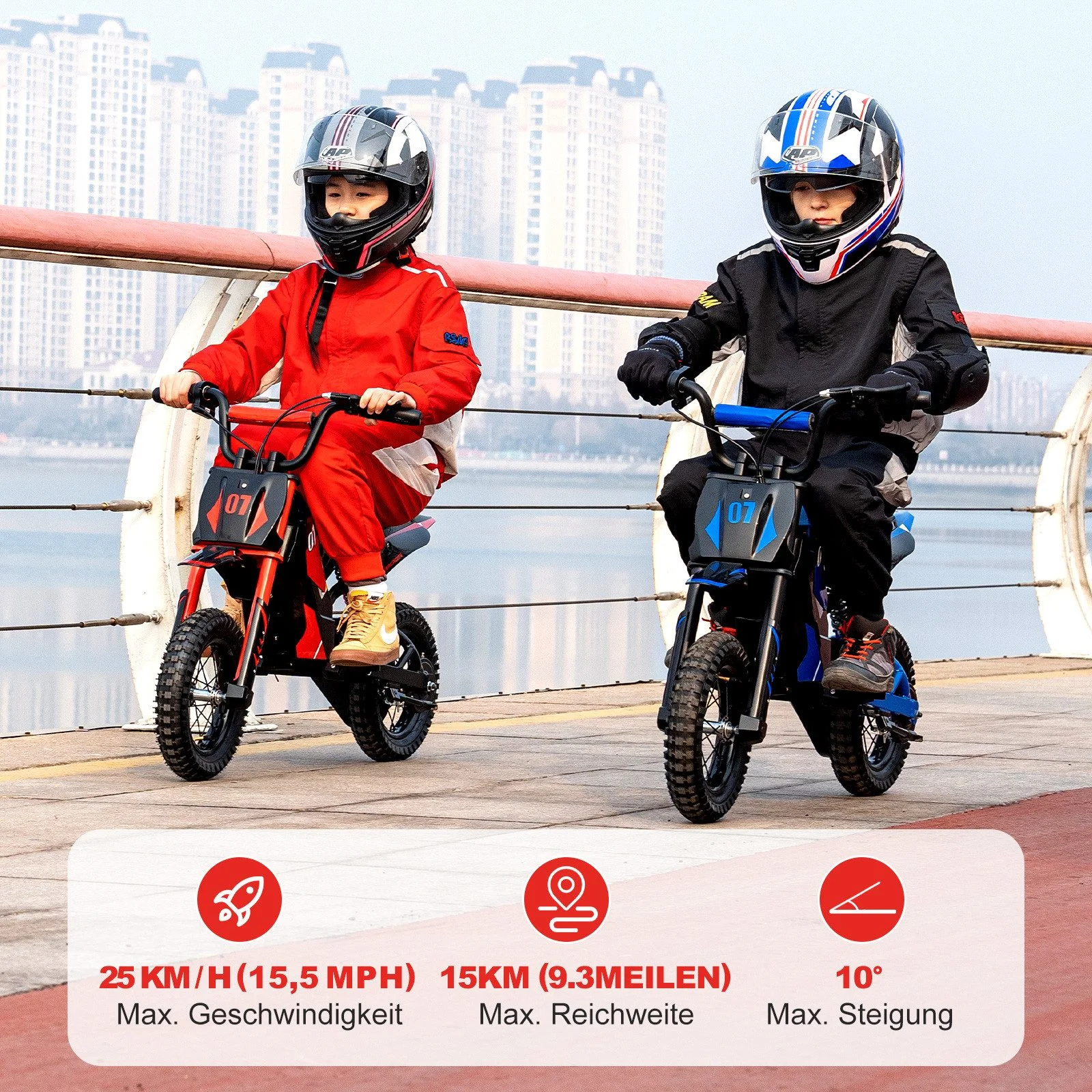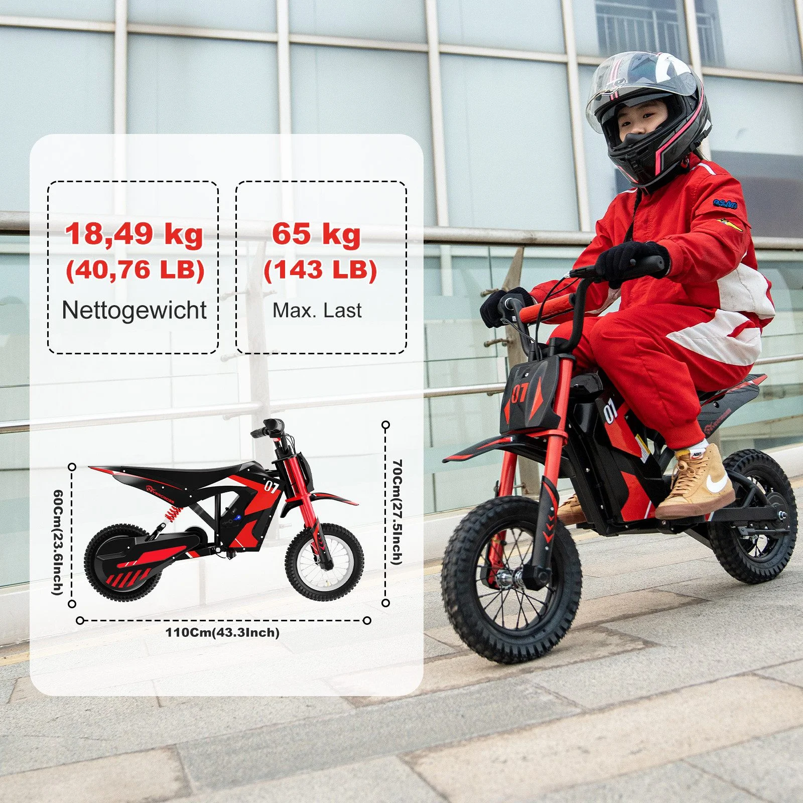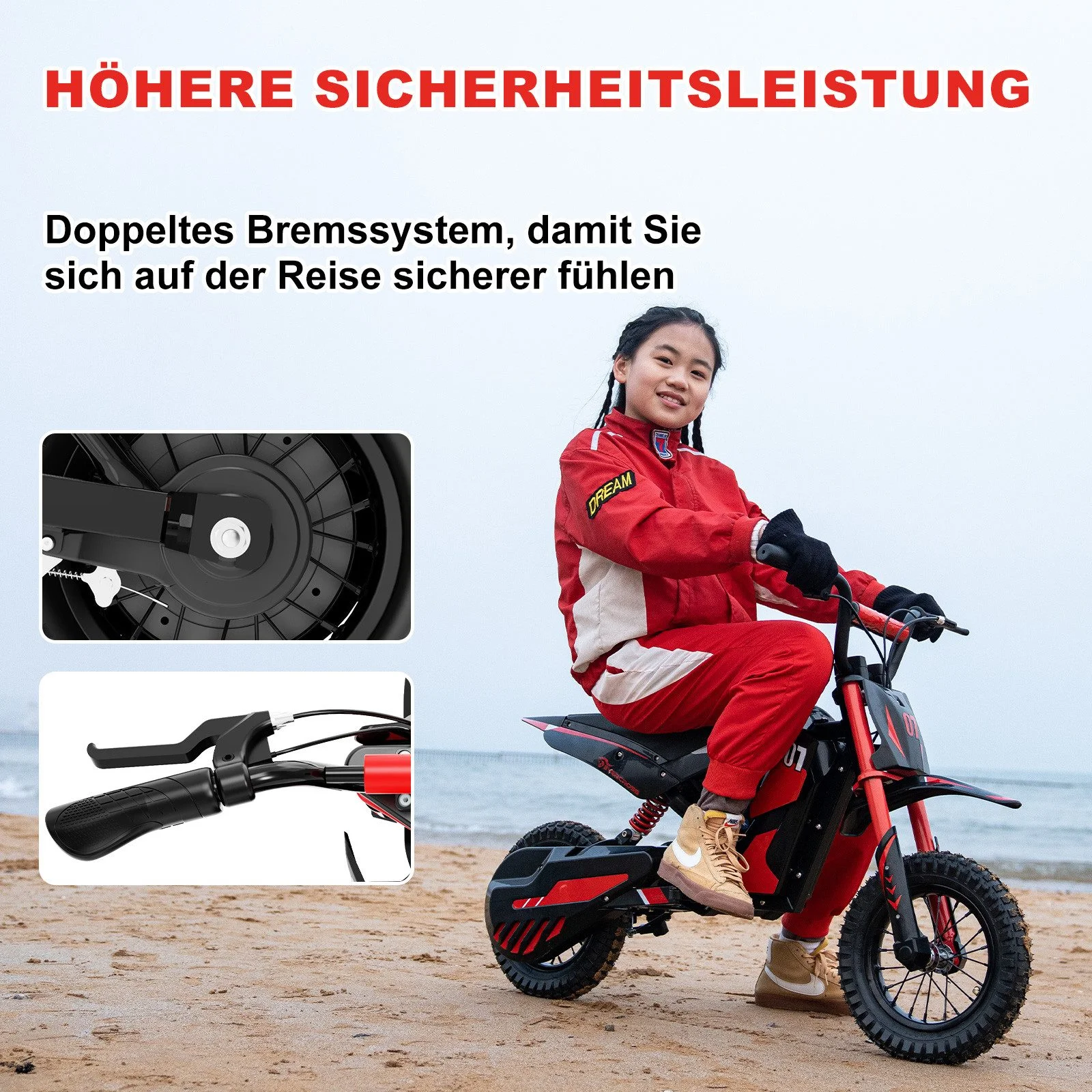 Dank des 36V/5,2Ah Akkus erreicht das Elektromotorrad eine Reichweite von bis zu 15 km. Die erhöhte Stabilität wird durch ein doppeltes Stoßdämpfungssystem und eine zuverlässige Trommelbremse unterstützt – ideal für aufregende Abenteuer auf verschiedenen Untergründen.
