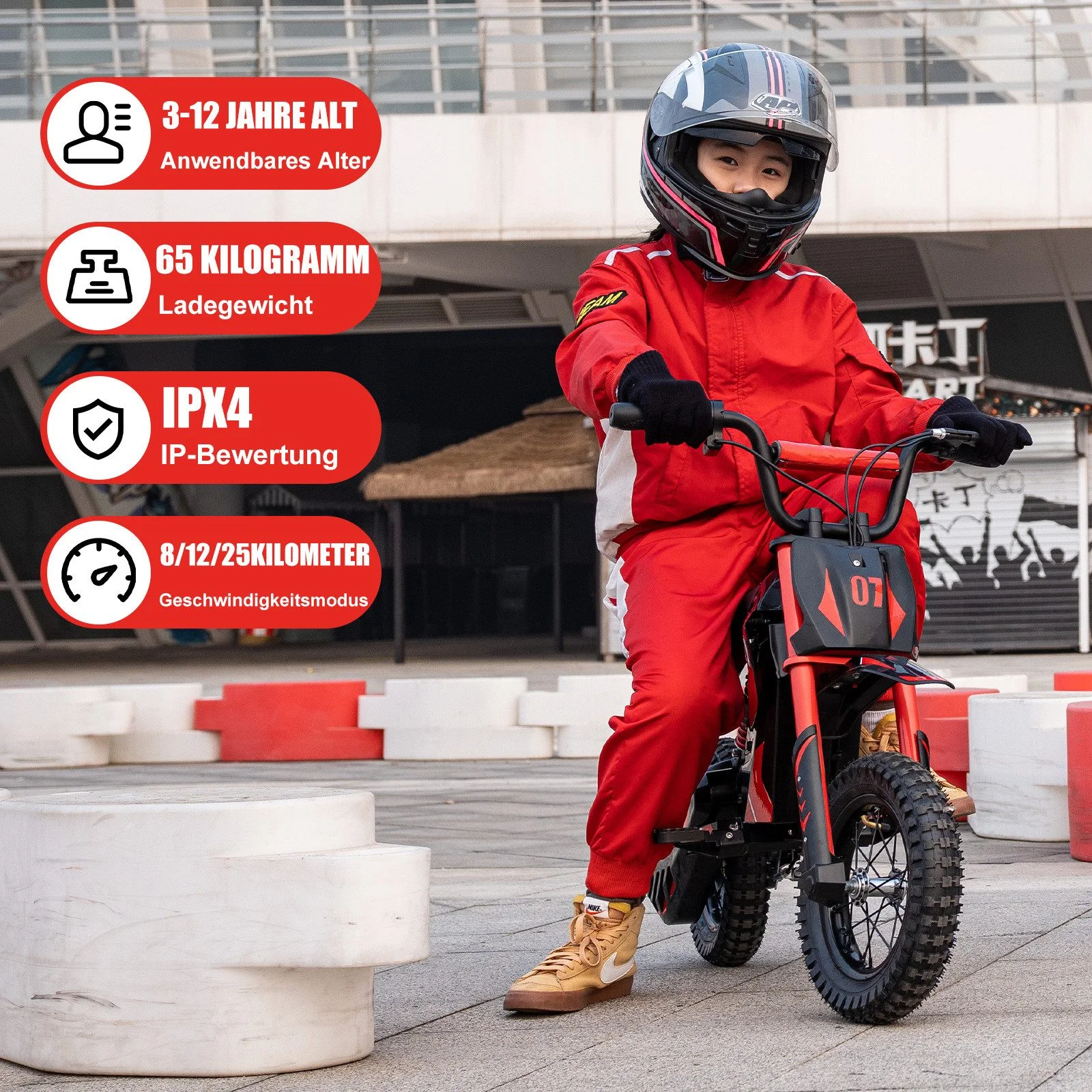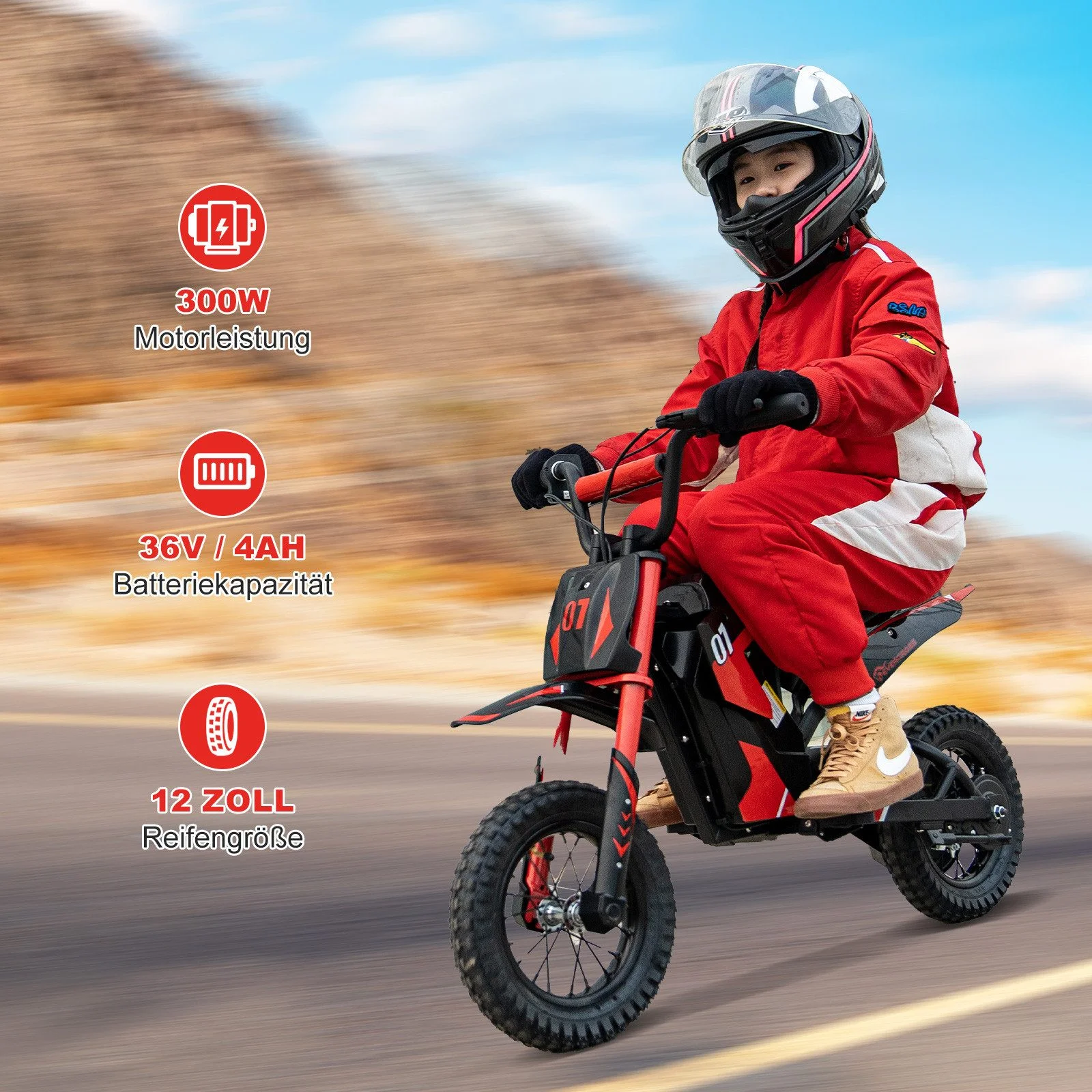 Highlights: Kraftvoller 300W Motor, drei Geschwindigkeitsstufen, robuste 12"-Offroadreifen, ergonomischer rutschfester Sitz, doppelte Stoßdämpfung, sichere Trommelbremse, modernes Offroad-Design.