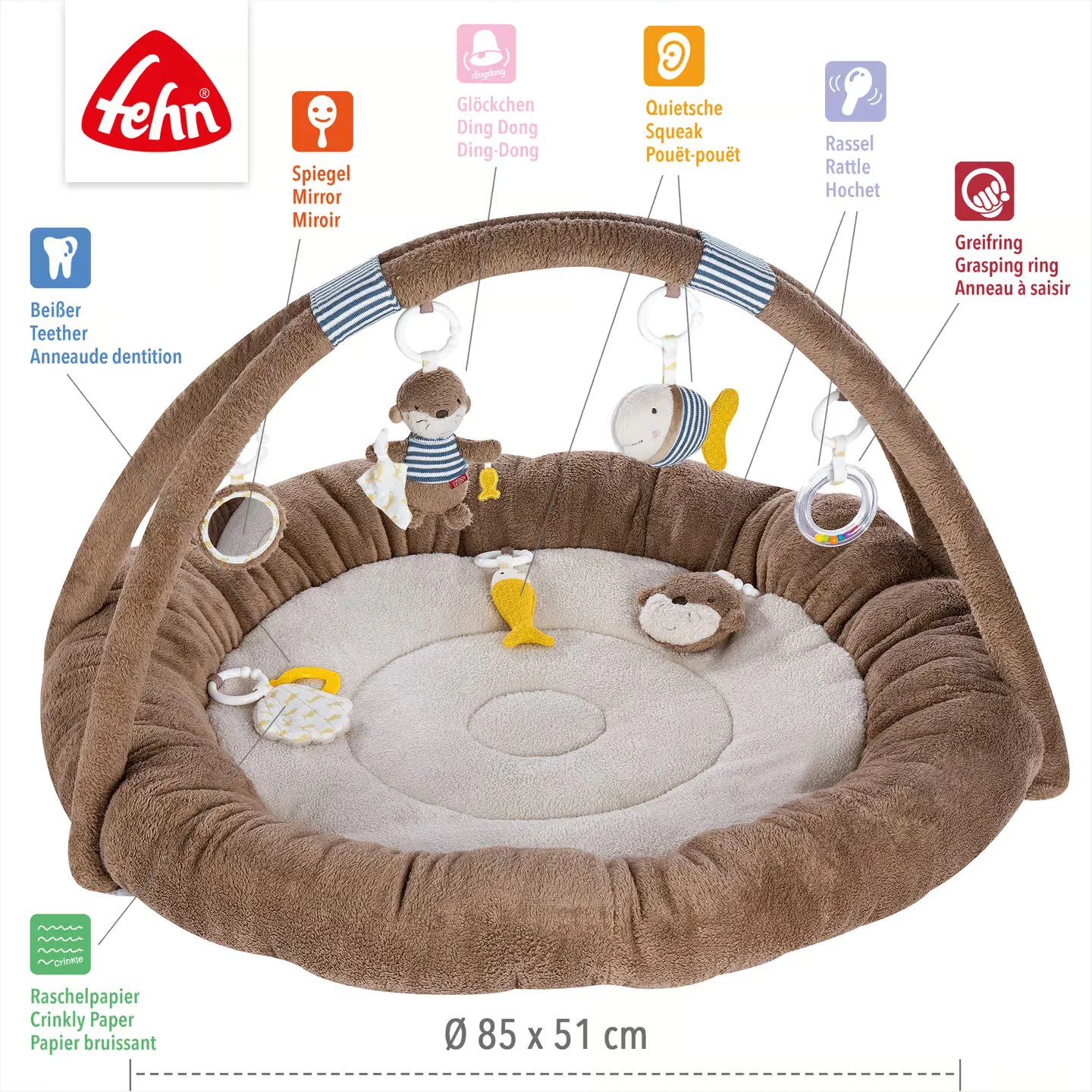 | Spielumfang | 7 abnehmbare Spielzeuge: Otter mit Glöckchen · 2 Fische mit Quietsche · Rasselring · Spiegel · Muschel mit Raschelpapier · Otterkopf |