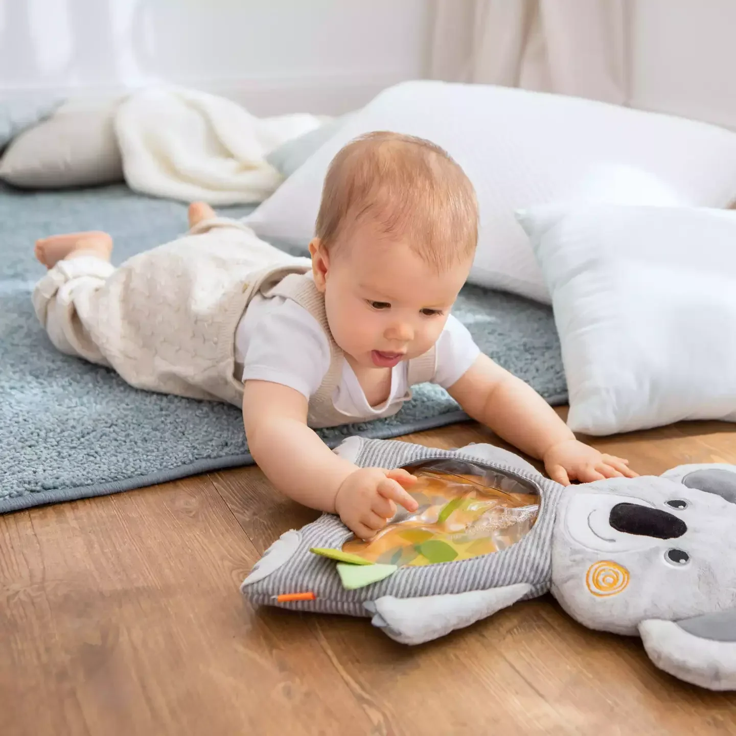 Die angenehm weiche Stoffhülle bietet hohen Liegekomfort und zusätzliche sensorische Effekte. Ideal zur Förderung der Feinmotorik und Wahrnehmung – und gleichzeitig ein hübscher Blickfang im Kinderzimmer.