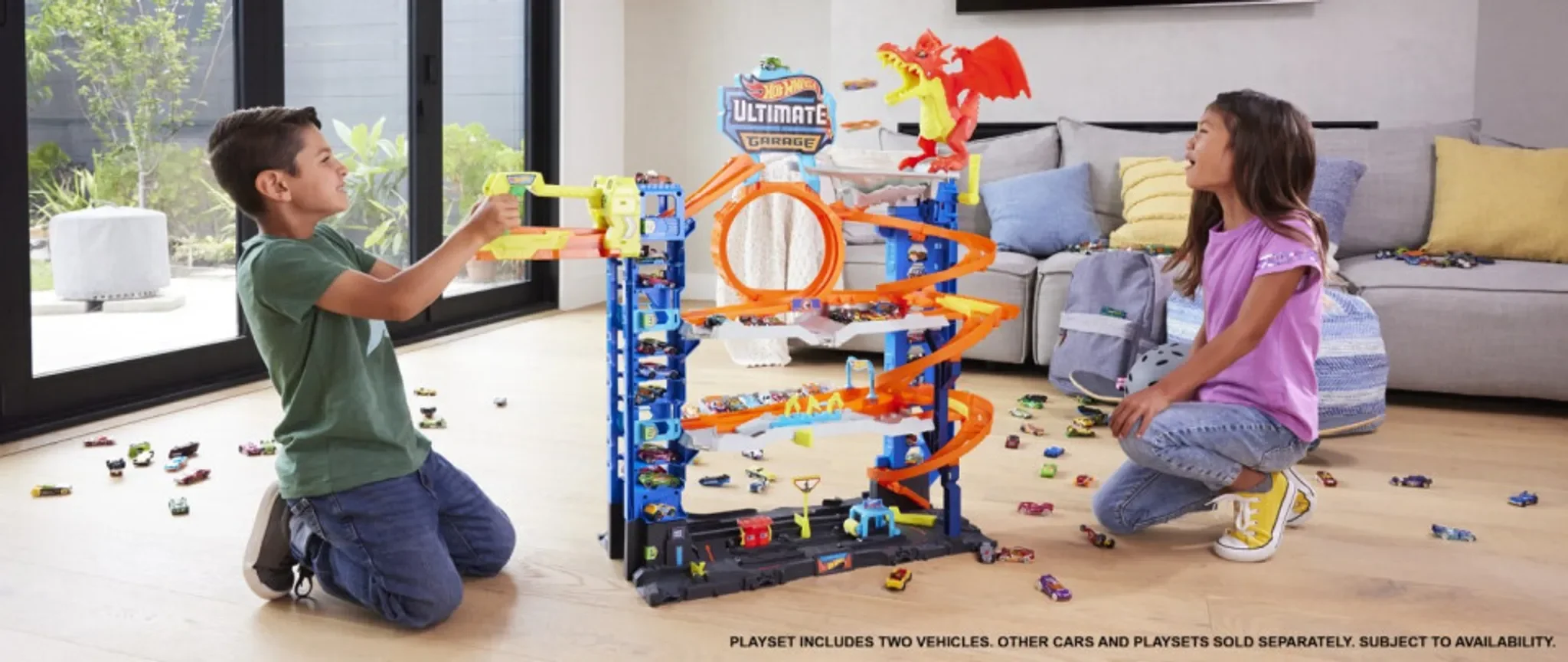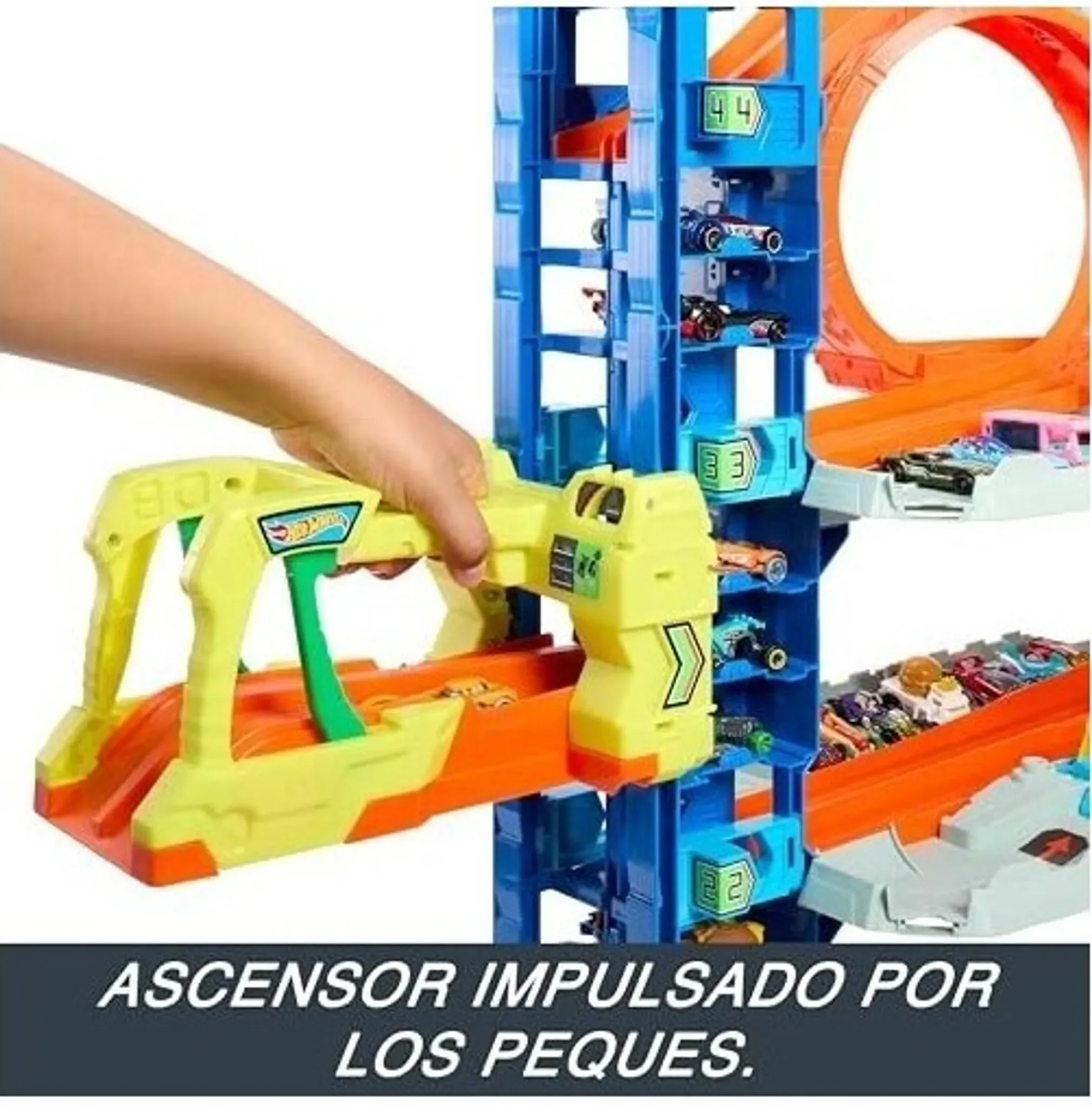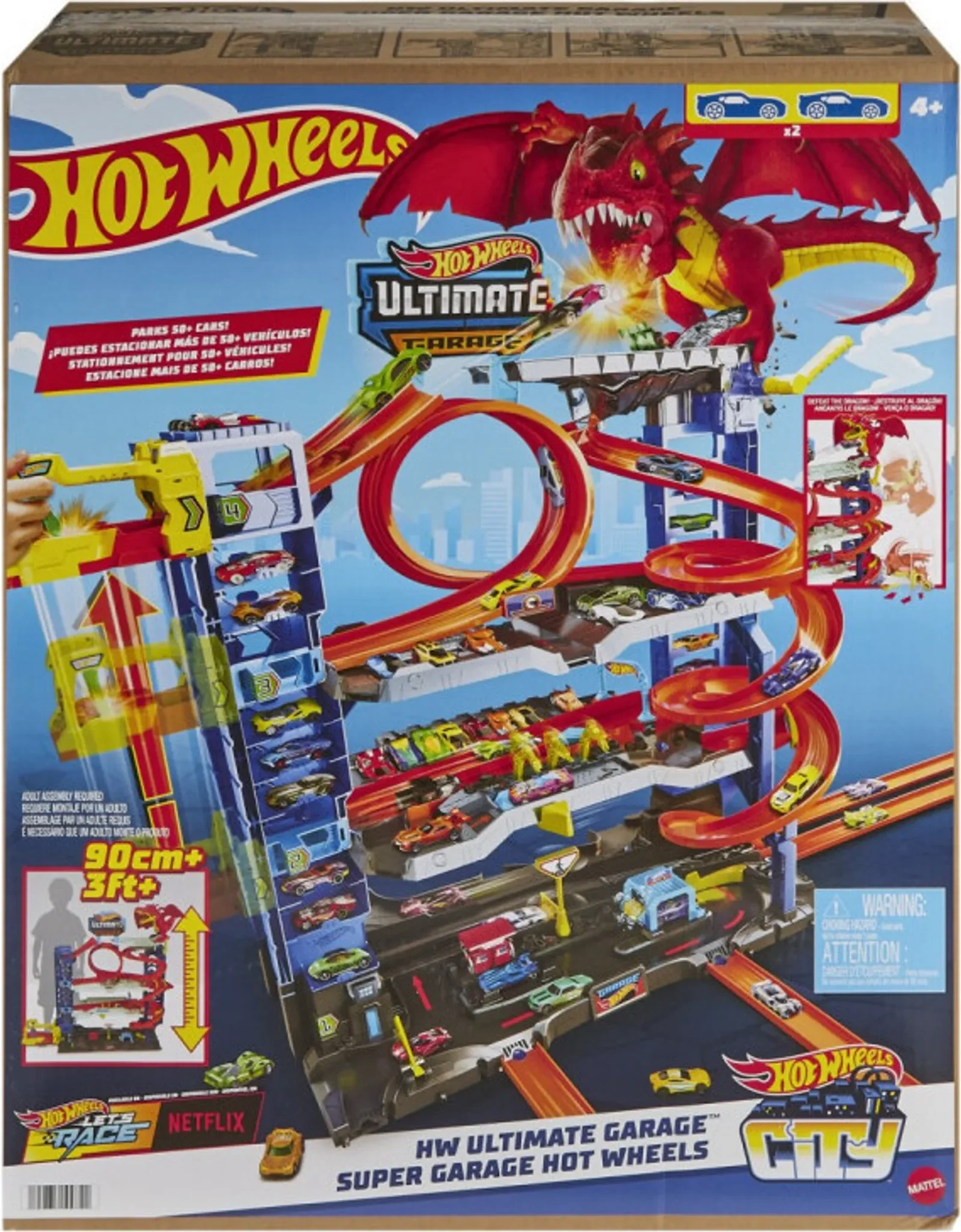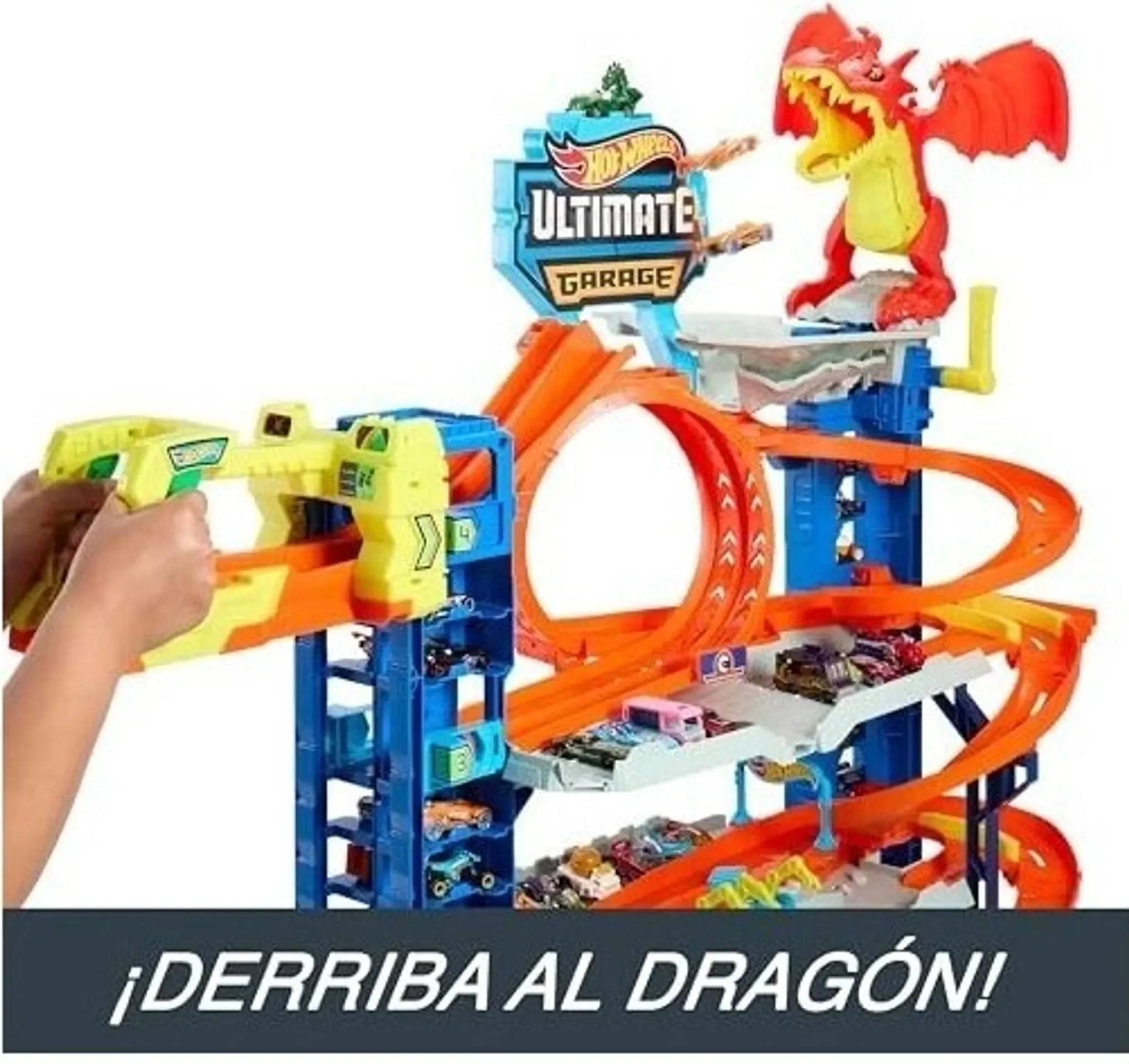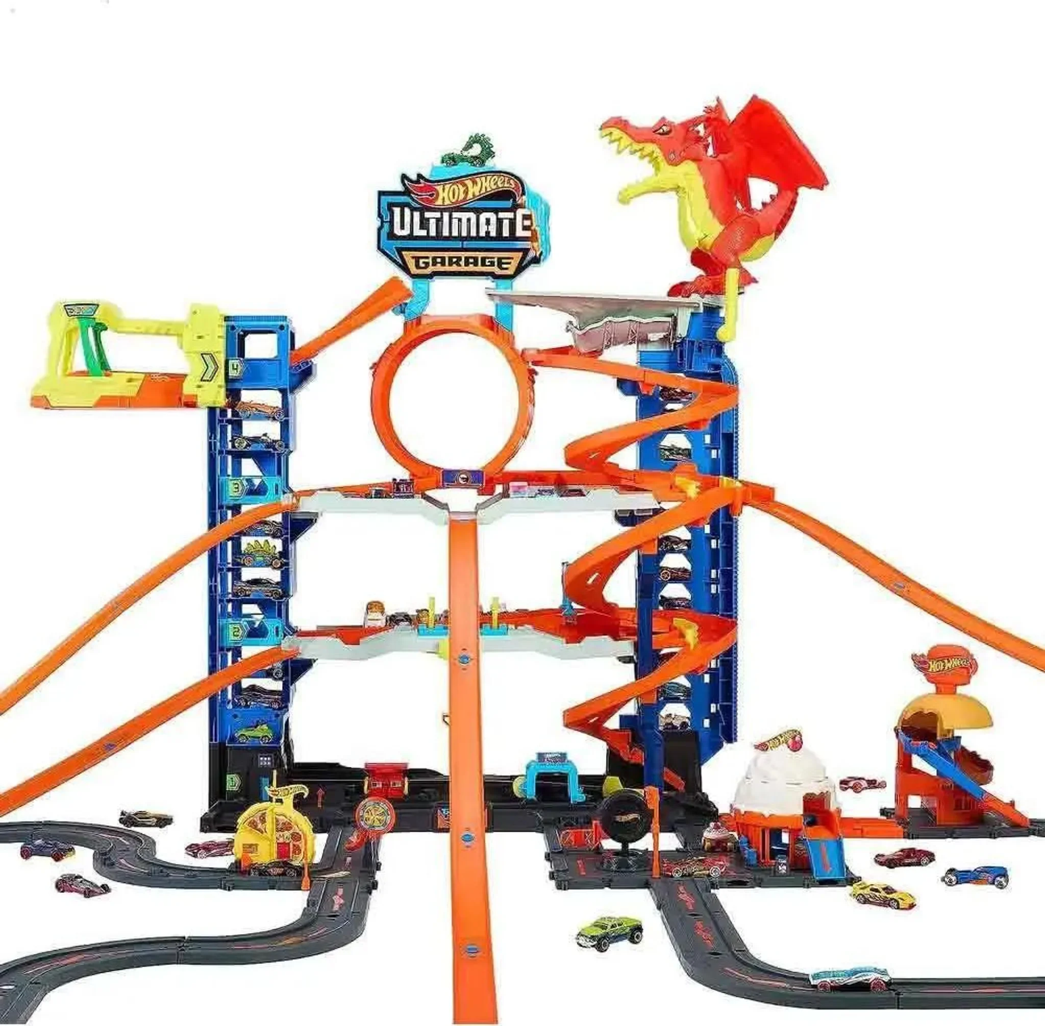 Die Hot Wheels City Ultimate Garage bietet vier Ebenen voller Rennspaß, Stunts und fantasievollem Spiel. Kinder können Kopf-an-Kopf-Rennen, Loopings, Abzweigungen und einen spektakulären Kampf gegen einen autofressenden Drachen erleben. Dank eines zweispurigen Aufzugs können die Autos direkt aus dem Lift gestartet werden. Das Set fasst über 50 Fahrzeuge im Maßstab 1:64 und lässt sich mit anderen Hot Wheels City Spielsets verbinden.