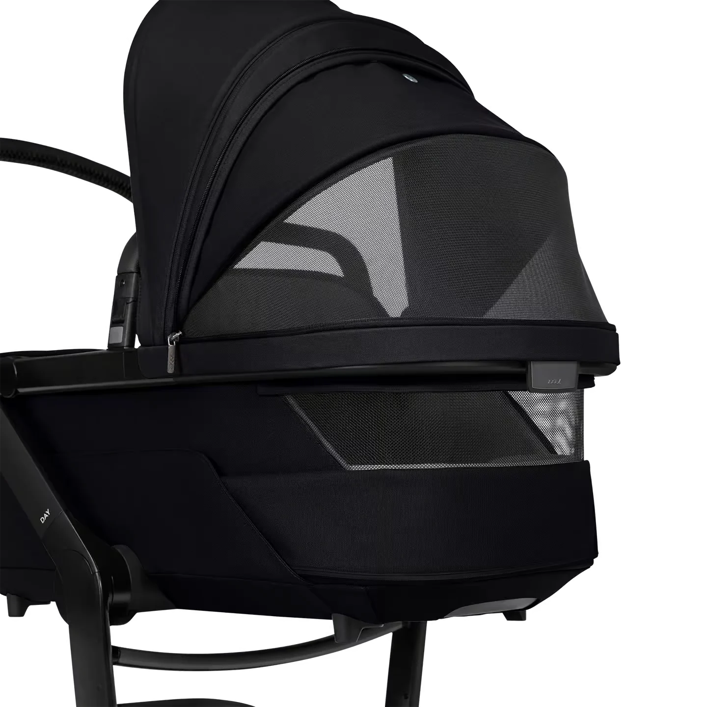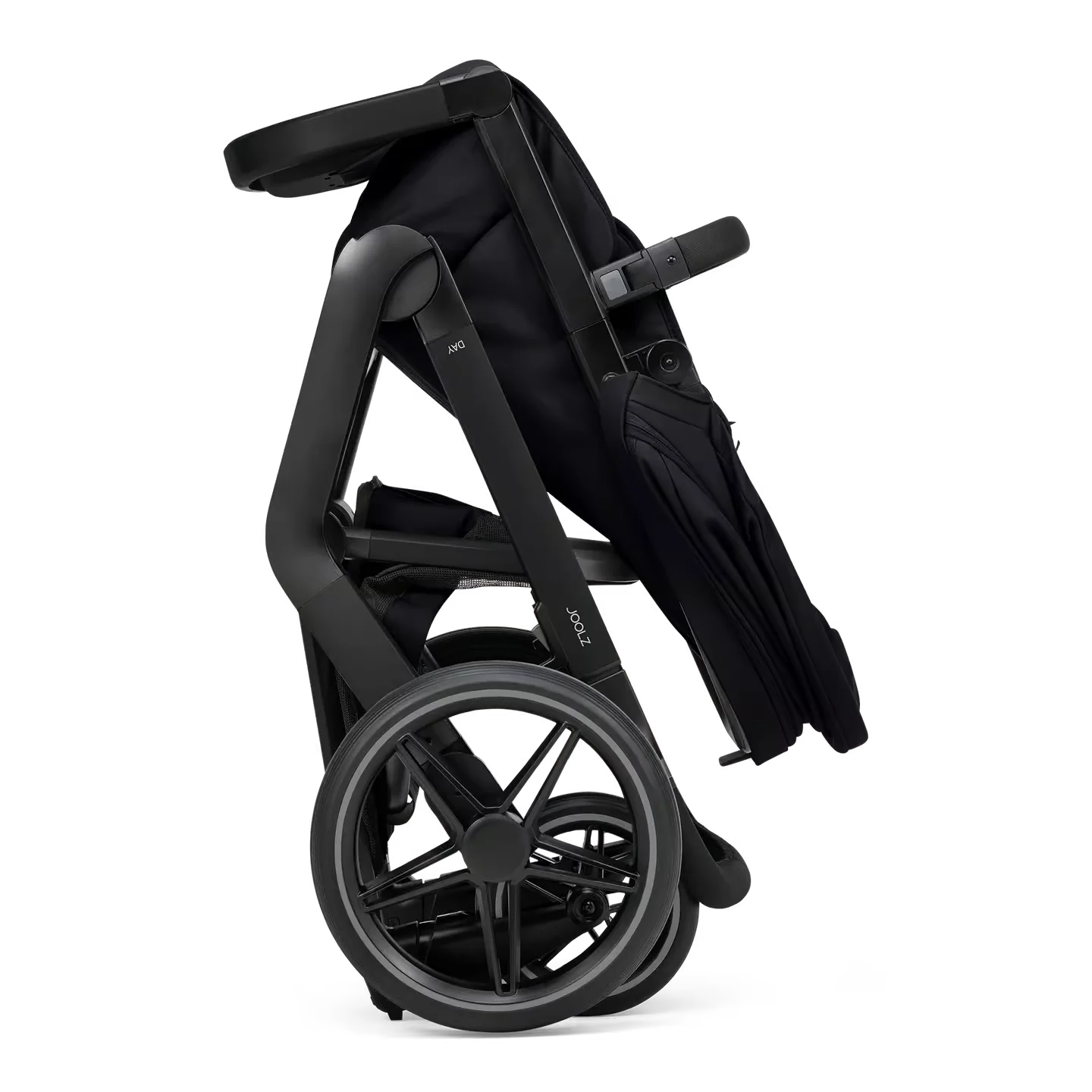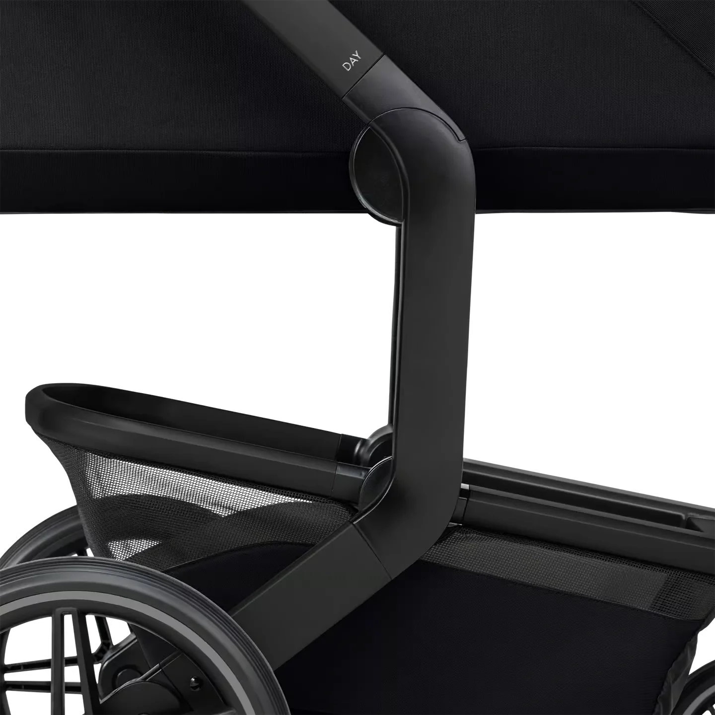 Das neue Gestell ist mit pannensicheren Reifen, Allradfederung und einem einhändig verstellbaren Schiebegriff ausgestattet, wodurch jedes Terrain angenehm befahrbar ist. Ebenso lässt sich der Day⁵ mit nur einer Hand zusammenklappen – mit praktischem Arretiermechanismus. Ein echter Premium-Allrounder im eleganten Space-Black-Design.