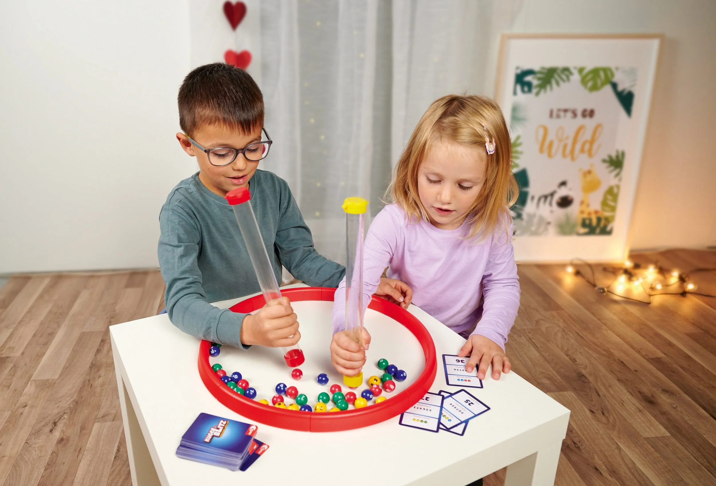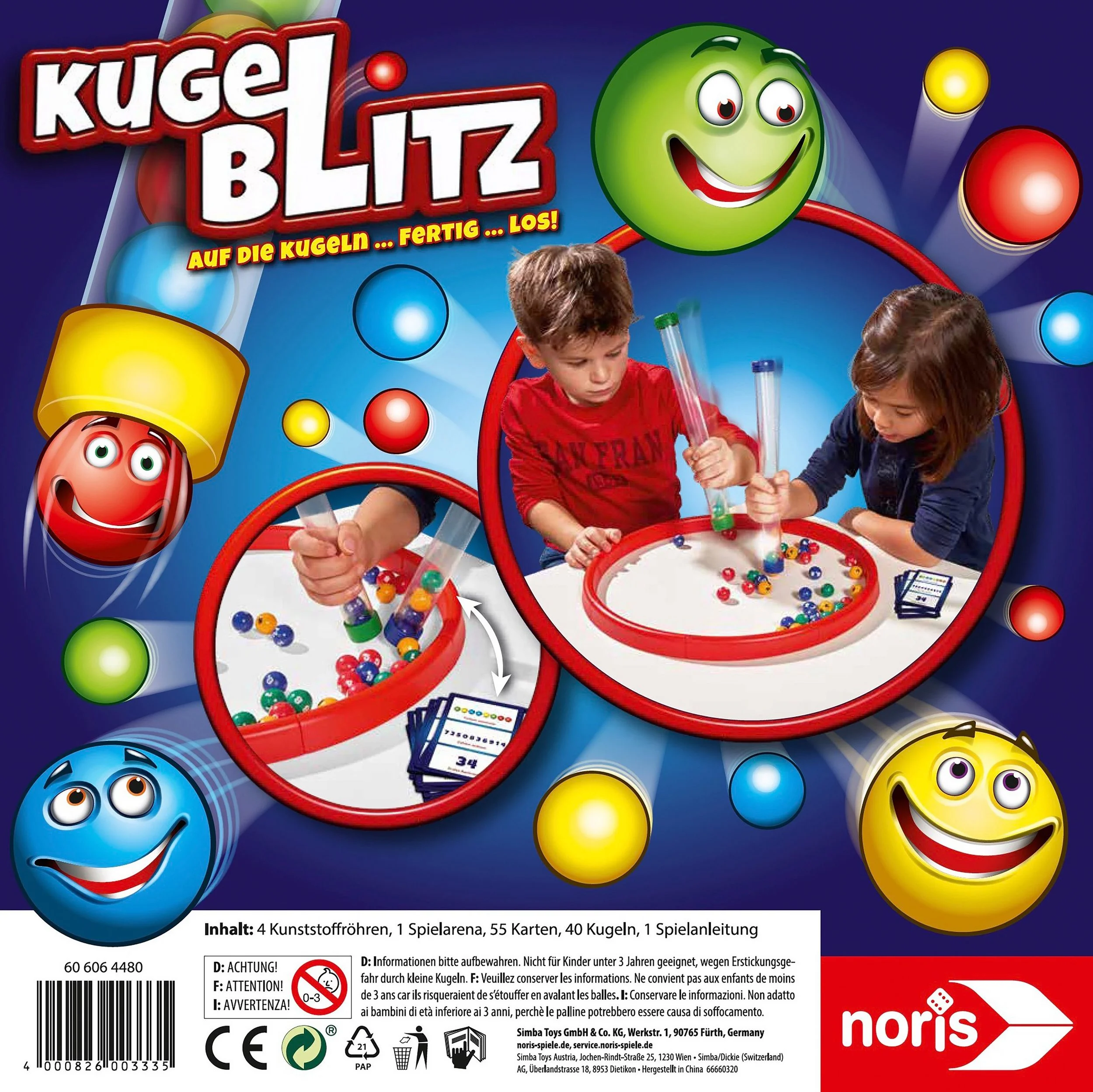 Das Kinderspiel „Kugelblitz“ sorgt für jede Menge Action und ist ein spannendes Geschicklichkeitsspiel für die ganze Familie. In diesem rasanten Kugel-Wettbewerb müssen die Spieler mit einer Röhre Murmeln in einer bestimmten Reihenfolge einsammeln. Die Kugeln sind in verschiedenen Farben und mit Nummern versehen, und die Spielkarten geben die Aufgabe vor.
