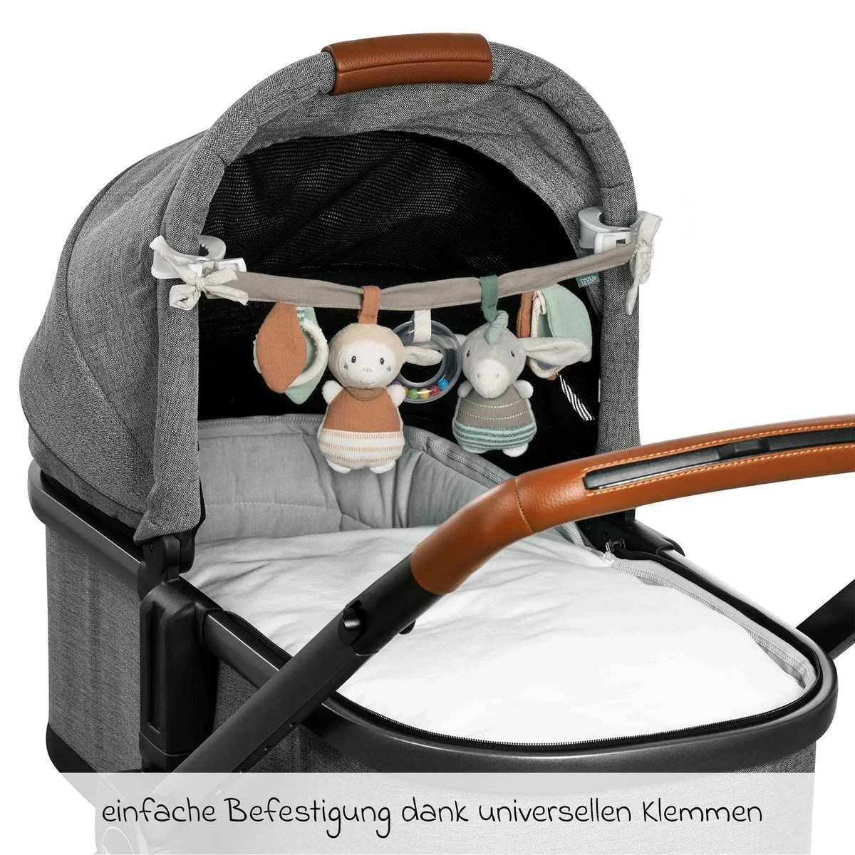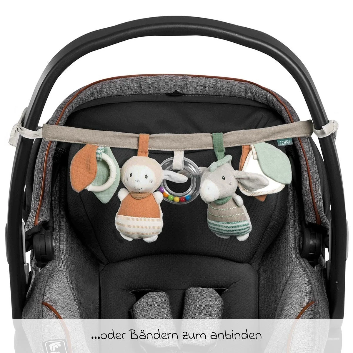 Die Kette lässt sich mithilfe stabiler Klemmen oder praktischer Bindebänder problemlos an Kinderwagen, Babyschale, Wiege oder Bettchen befestigen. Sanfte Farben und angenehm weiche Materialien machen die Tierchen zu treuen Begleitern, die Babys von Geburt an sicher entdecken können. Sicherheit und Qualität wurden durch unabhängige Testinstitute geprüft und bestätigt.