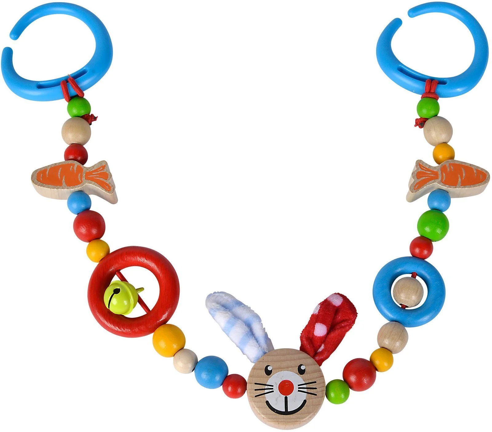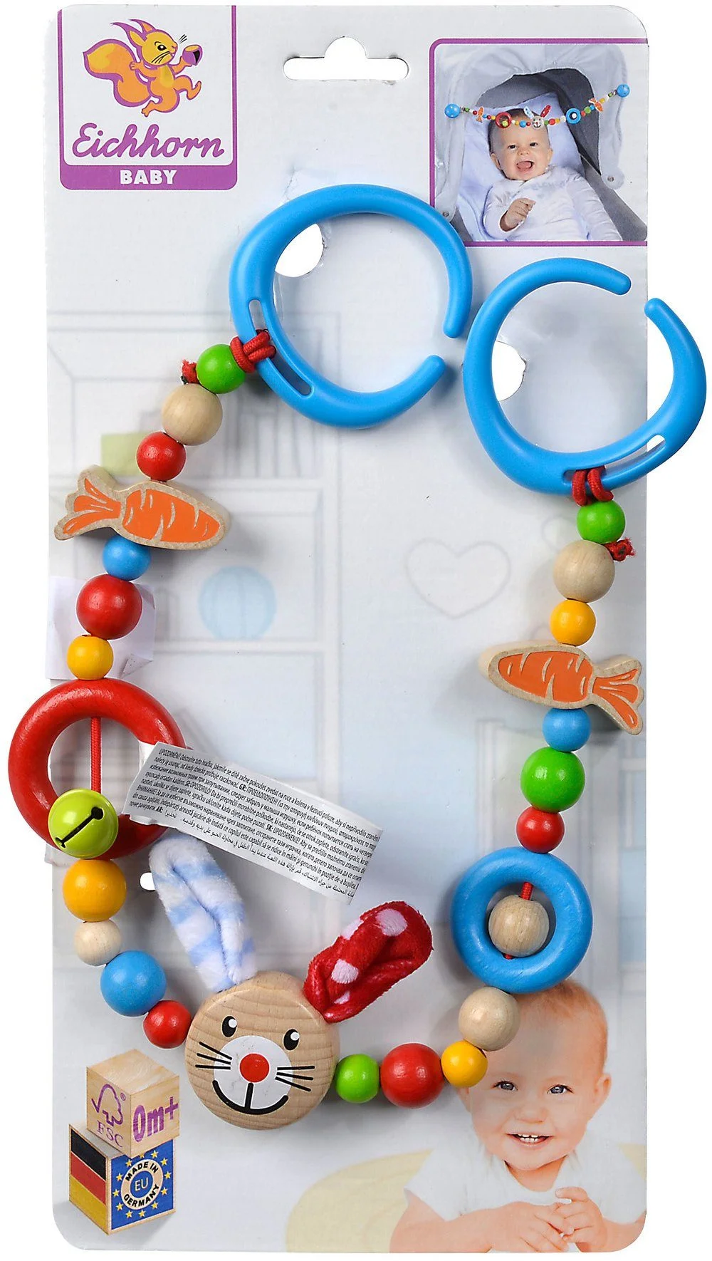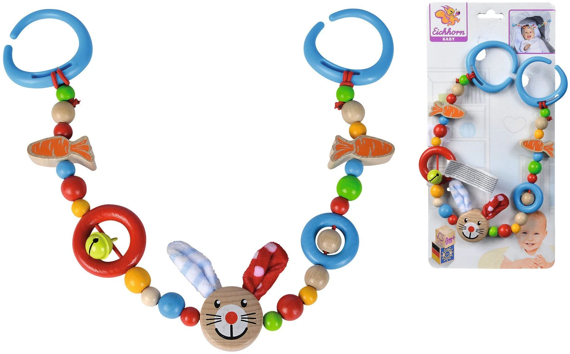 Die farbenfrohe Kinderwagenkette von Eichhorn wird in Deutschland aus FSC®-zertifiziertem Holz hergestellt und begeistert mit einer liebevollen Gestaltung. Der niedliche Hasenkopf mit weichen Plüschohren in der Mitte lädt Babys ab den ersten Lebensmonaten zum Entdecken, Greifen und Staunen ein.