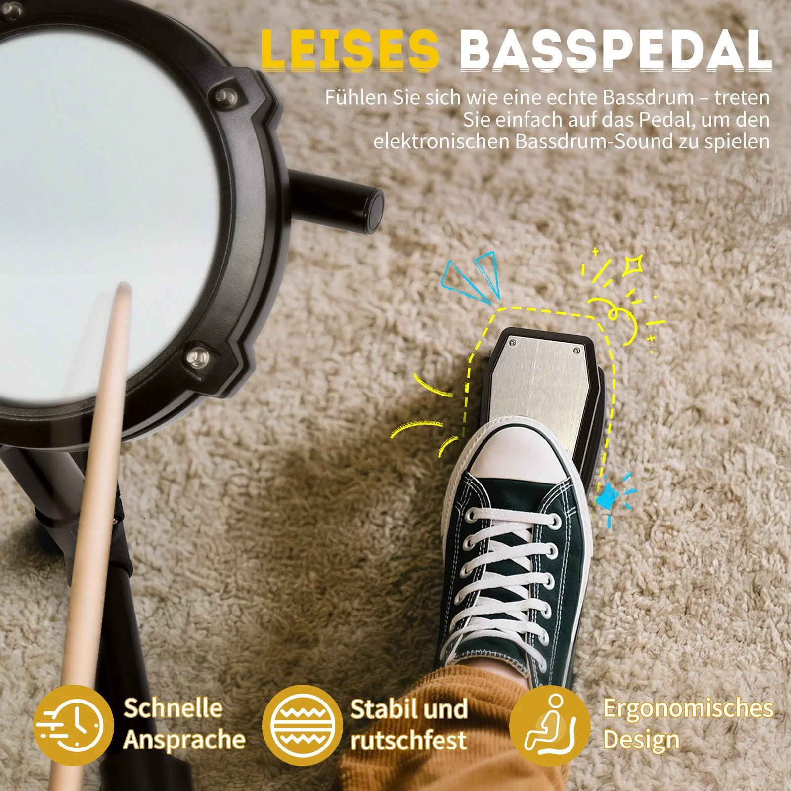 Fazit: Ein vielseitiges, kindgerechtes E-Drum-Set mit realistischen Mesh-Pads, 150 Sounds und umfangreichem Zubehör – perfekt für junge Drummer, die spielerisch und strukturiert lernen möchten.