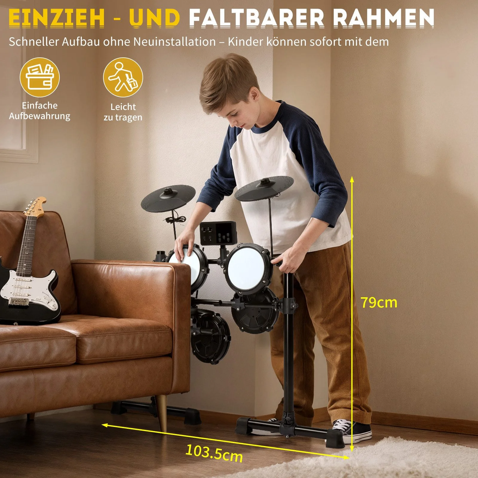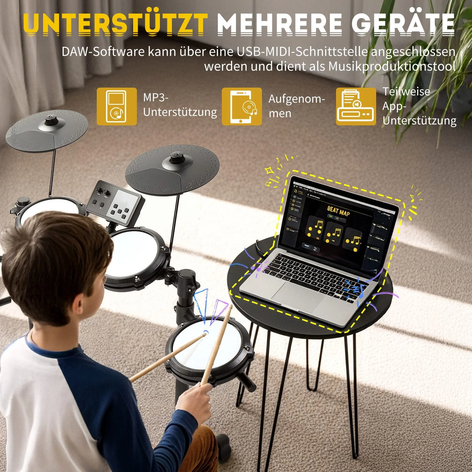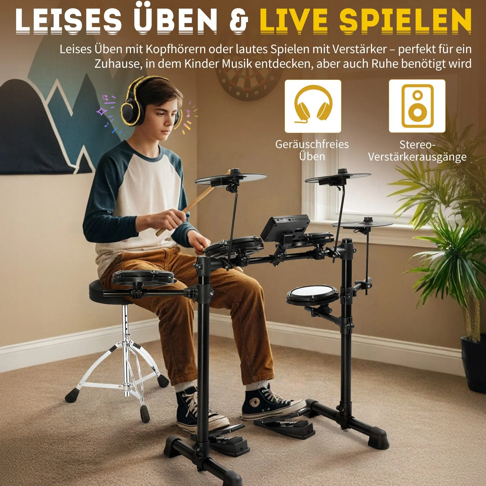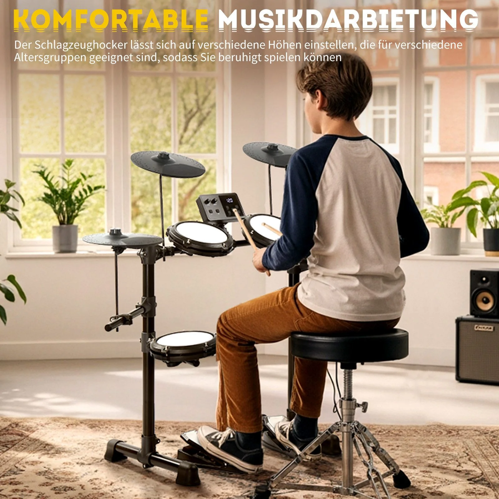- Inklusive Drumhocker, Kopfhörer & Drumsticks – sofort spielbereit