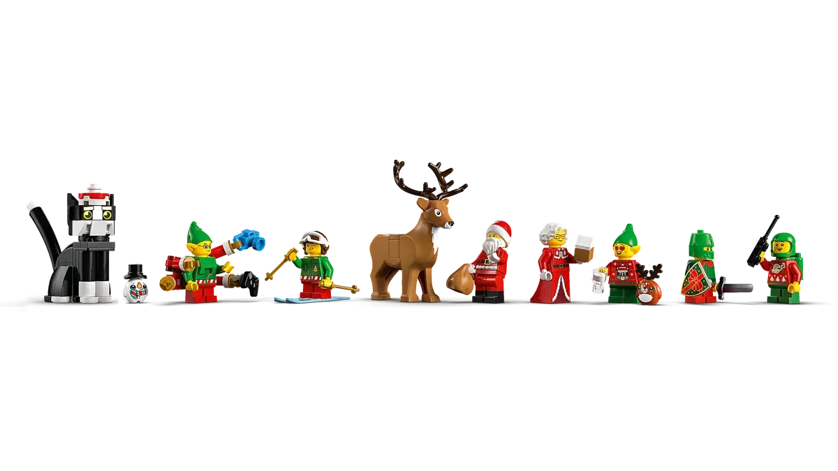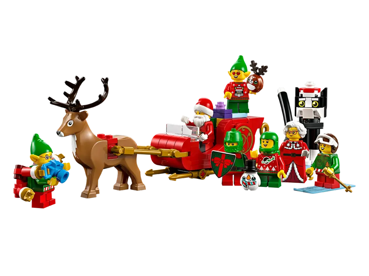 Weihnachtsmann mit Schlitten, Rentier, Schneemann- und Rentier-„Plüschfiguren“, Katze Cataclaws (aus LEGO Steinen), Frau Weihnachtsmann, 5 Elfen |
