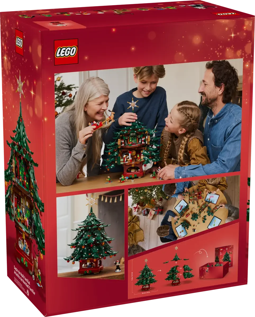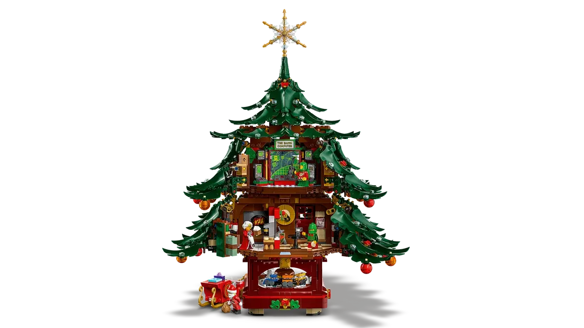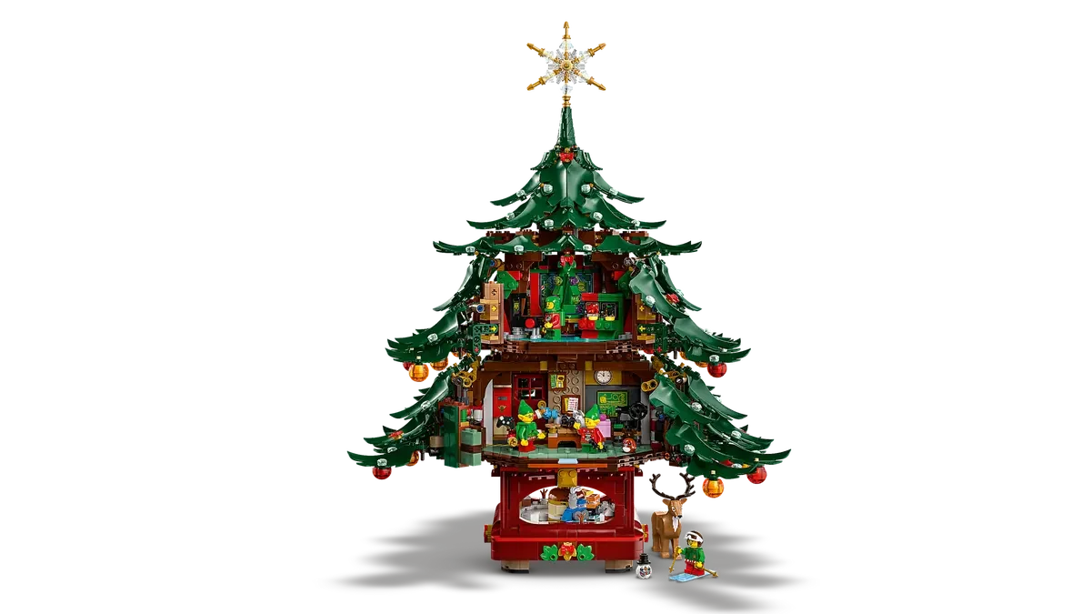 Im Inneren des Baums warten vier Räume – Küche, Werkstatt des Weihnachtsmanns, Kantine und Unterhaltungsraum für die Elfen – sowie eine versteckte Eisenbahn im Sockel. Ergänzt wird das Modell durch den Weihnachtsmann im Schlitten, ein Rentier, Schneemann- und Rentier-„Plüschfiguren“, die Katze Cataclaws, Frau Weihnachtsmann und fünf Elfen. Über Drehknäufe lassen sich Zug und Küchenuhr bewegen. Nach den Feiertagen kann der Baum in Segmente zerlegt und platzsparend verstaut werden. Die LEGO Builder App unterstützt das gemeinsame Bauerlebnis mit 3D-Ansichten und Build-Together-Funktion.