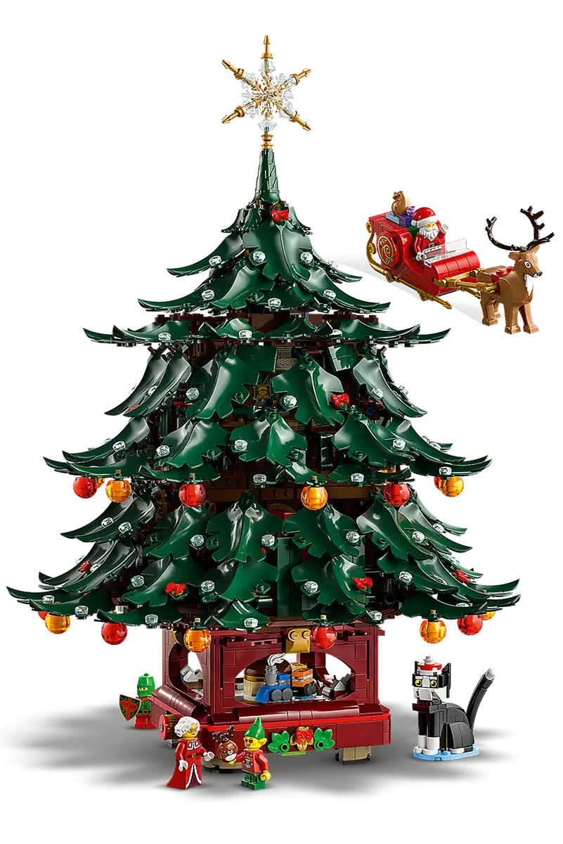 3.171 LEGO® Elemente für den Familien-Weihnachtsbaum, Bauteile für Weihnachtsbaum, Sockel und 4 Innenräume, Figuren: Weihnachtsmann, Frau Weihnachtsmann, 5 Elfen, Rentier, Schneemann- & Rentier-„Plüschfiguren“, Katze Cataclaws, Schlitten des Weihnachtsmanns, Eisenbahn im Sockel, Gedruckte Bauanleitung + digitale Anleitung in der LEGO® Builder App. |
