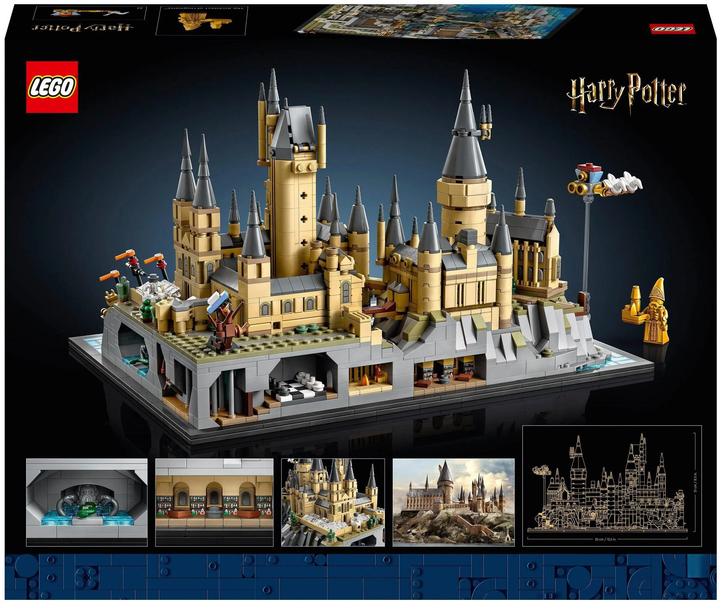 Highlights: Erstes komplettes Schloss-Hogwarts-Gelände • Magische Filmszenen im Miniaturmaßstab • Goldfarbene Architektenfigur • Umfangreiche Untergrundräume • Zahlreiche ikonische Zusatzmodelle.