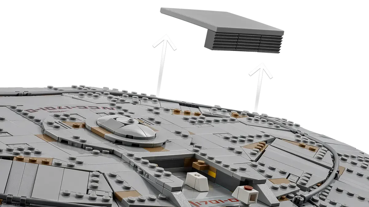 Abnehmbare Kommando-Untertasse Sekundärrumpf & Warpgondeln mit farbigen Akzenten 2 Shuttlepods & aufklappbarer Hangar Neigbarer Präsentationsständer mit Infotafel Digitale 3D-Bauanleitung in der LEGO® Builder App |