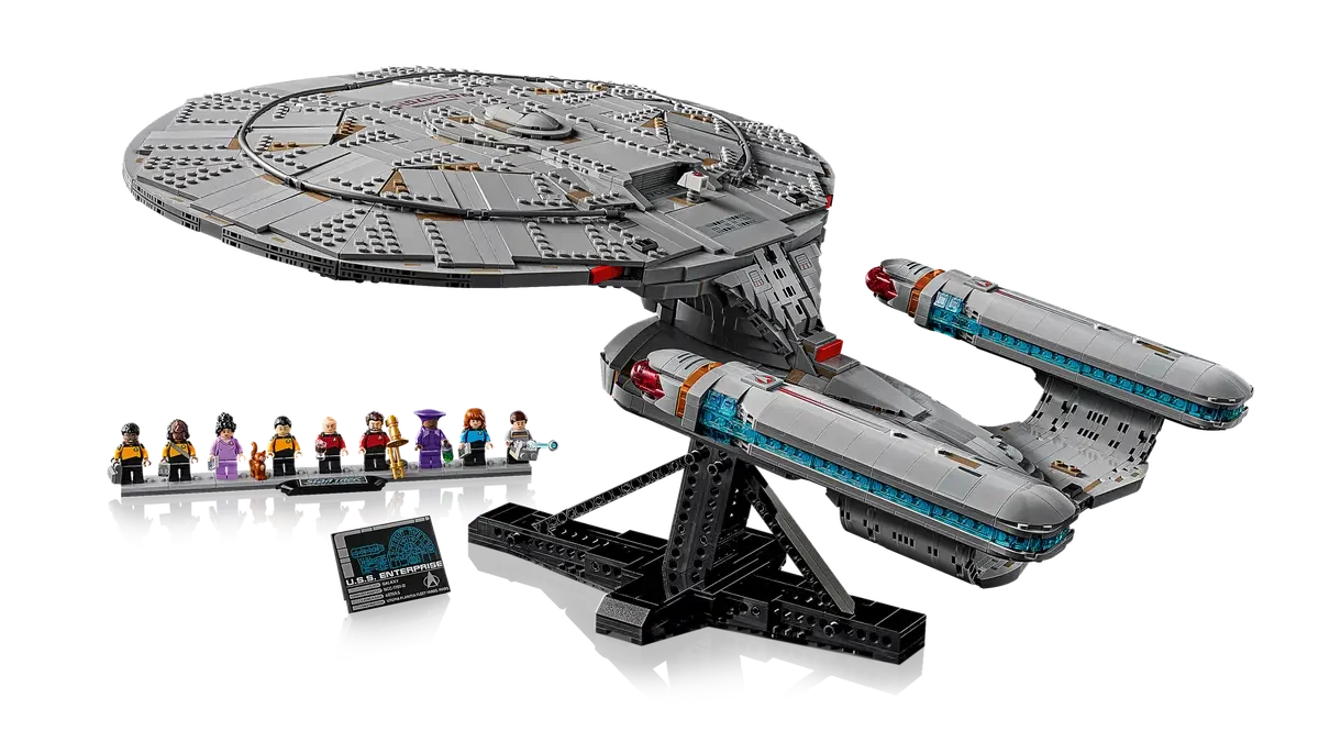 Zwei Shuttlepods, ein geneigter Präsentationsständer mit Infotafel sowie eine Minifiguren-Stellplatte runden das Set ab. Neun kultige Charaktere – darunter Picard, Riker, Data und La Forge – sowie umfangreiches Zubehör machen dieses Modell zu einem echten Highlight für Trekkies. Das Set enthält außerdem eine digitale 3D-Bauanleitung über die LEGO Builder App.