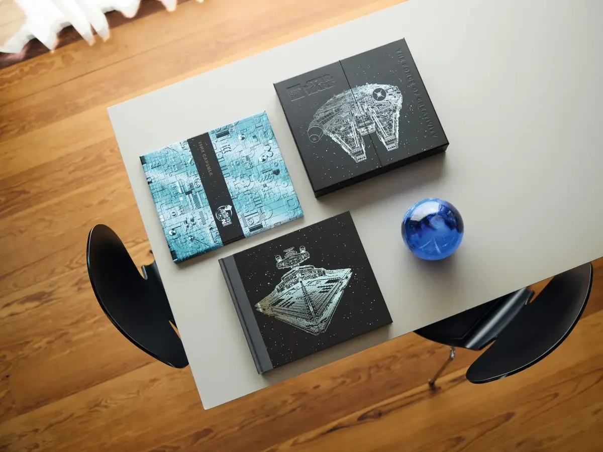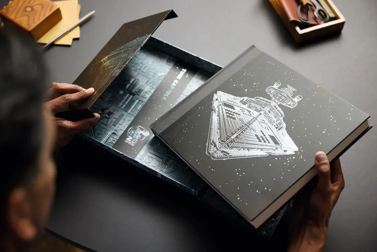 Der hochwertige Schuber enthält zudem eine exklusive „Zeitkapsel“ – eine Sammlung seltener LEGO Star Wars Erinnerungsstücke wie frühe Werbeskizzen, Postkarten, Reproduktionen historischer Dokumente, unveröffentlichte Entwürfe und eine Nachbildung der legendären Einladungsbox zur Spielwarenmesse 1999. Ein Premium-Sammlerstück für Erwachsene, die das LEGO Star Wars Universum lieben.
