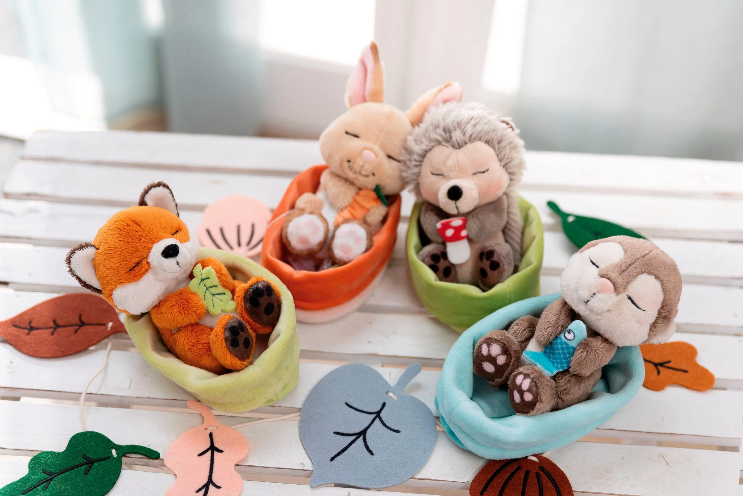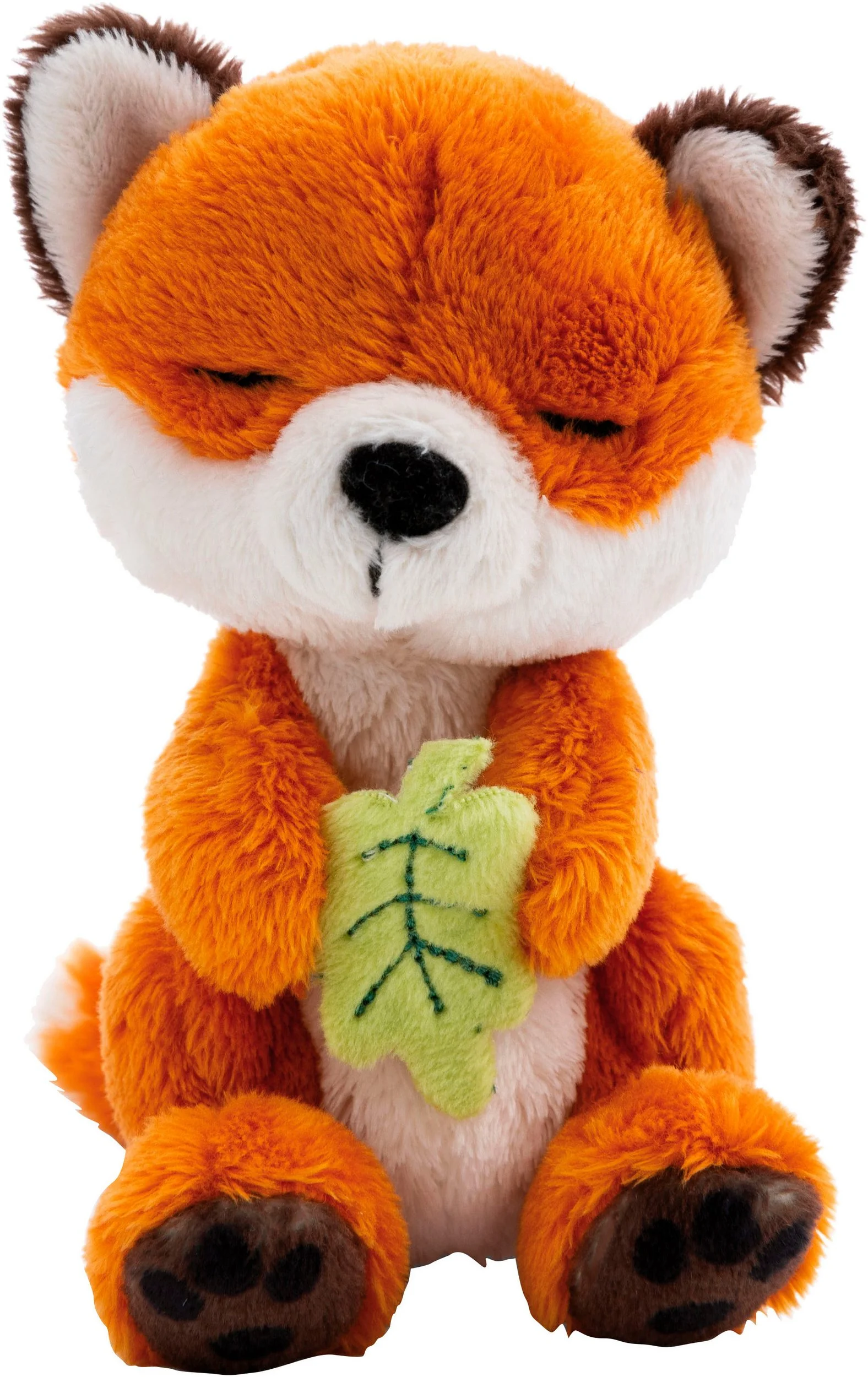 Der Sleeping Pets GREEN Fuchs von NICI begeistert mit seinem weichen Plüschfell in Rotbraun und Weiß, liebevollen Details wie gestickten Schlafaugen, spitzen Ohren und einem buschigen Schwanz. Das Fuchsbaby hält ein kleines grünes Blatt in den Pfötchen und sorgt dank der besonders weichen Füllung für eine anschmiegsame Haptik.