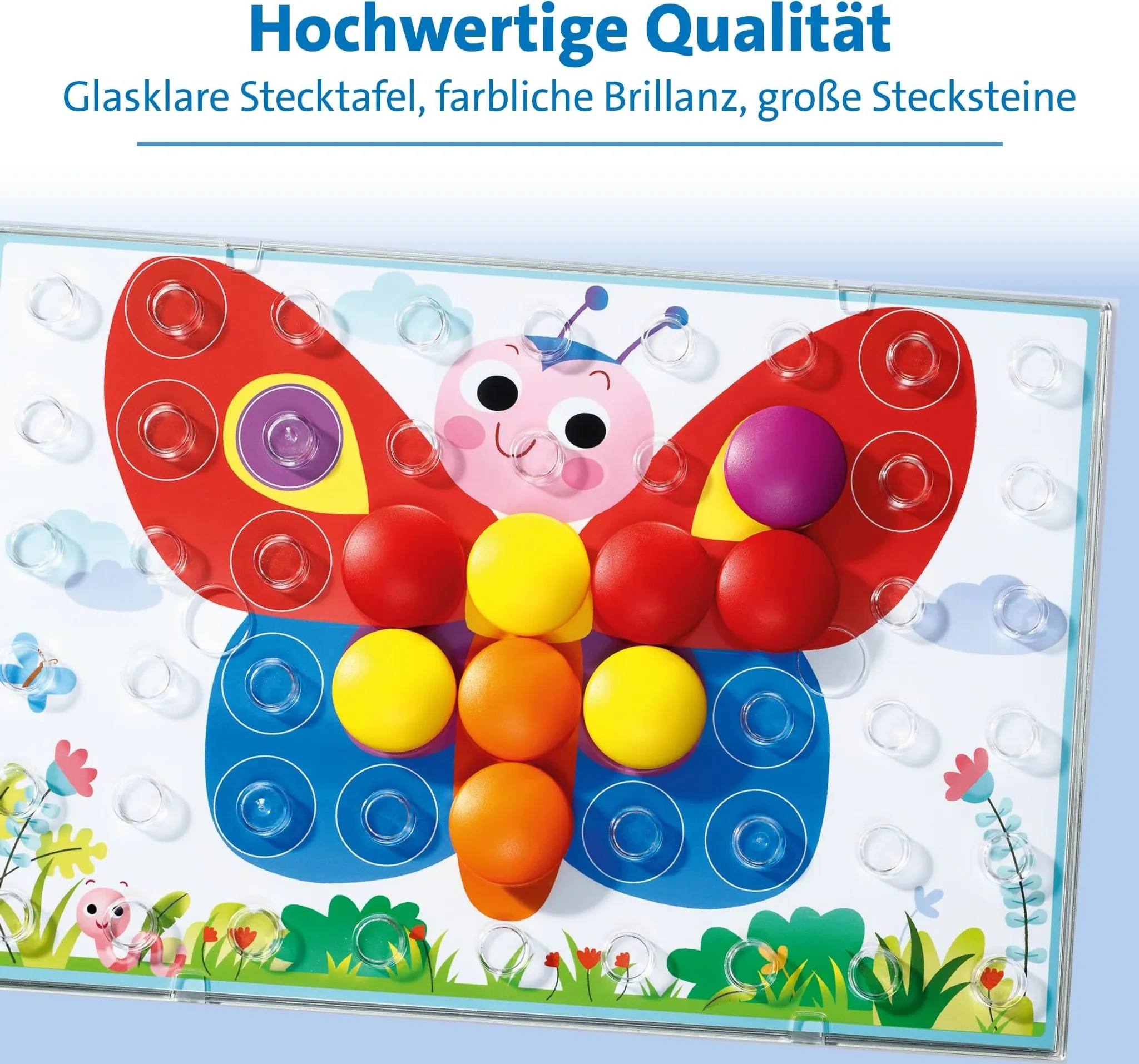 | Im Paket | 6 × beidseitig bedruckte Motivtafeln (12 Motive), 40 × Stecksteine, 1 × transparente Stecktafel, 1 × Anleitung |