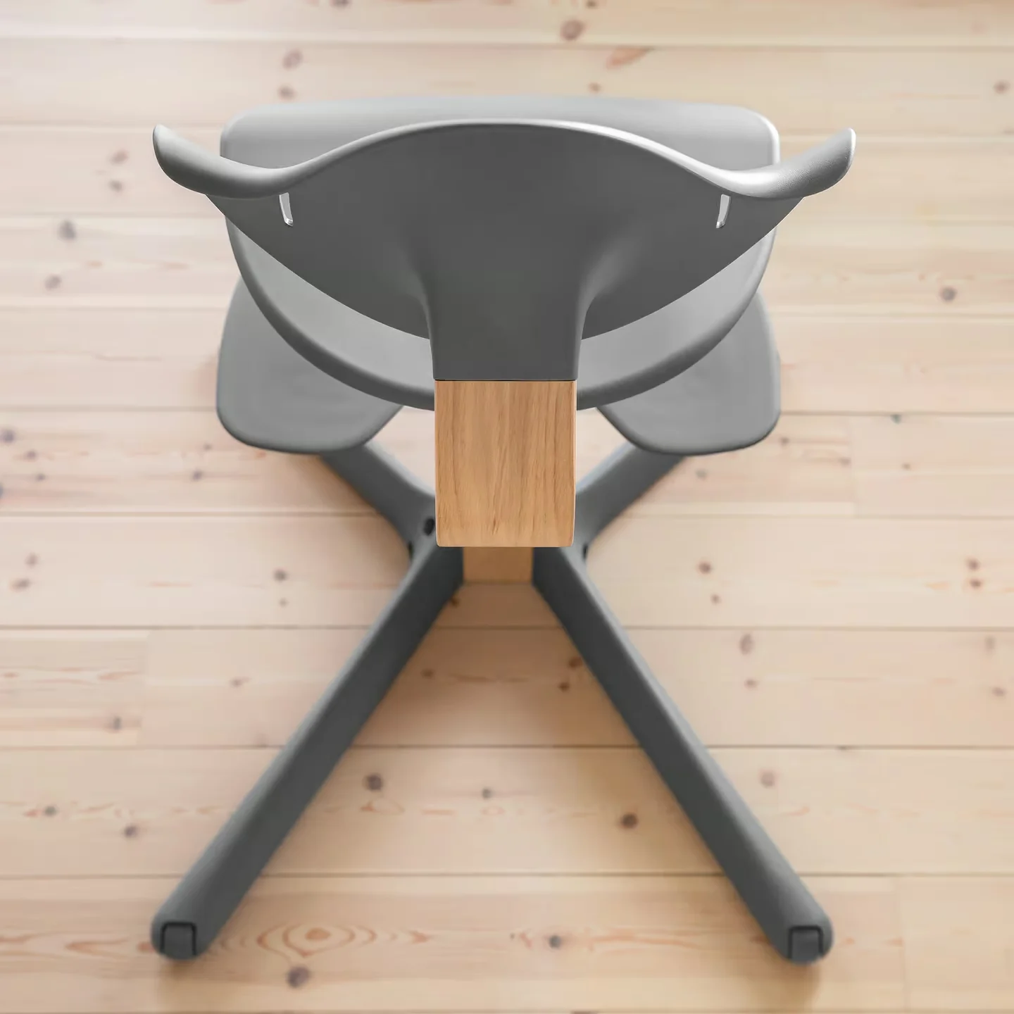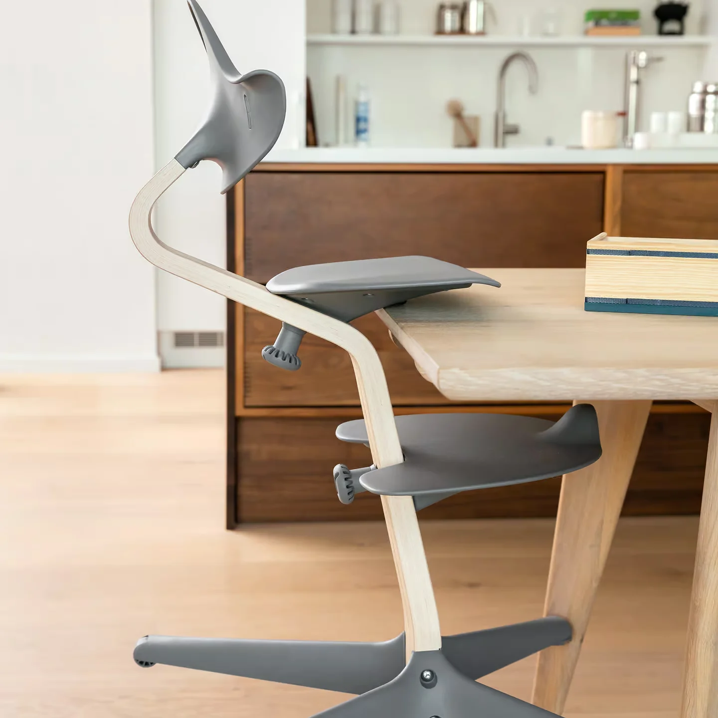 Der stabile Mittelträger aus europäischem Holz sorgt für Festigkeit und Flexibilität. Die Fußstütze unterstützt eine gesunde Sitzhaltung, während die kippsicheren Räder Sicherheit bieten. Mit seinem geringen Gewicht lässt sich der Stuhl leicht im ganzen Zuhause bewegen und für schnelles Reinigen einfach an der Tischkante einhängen.