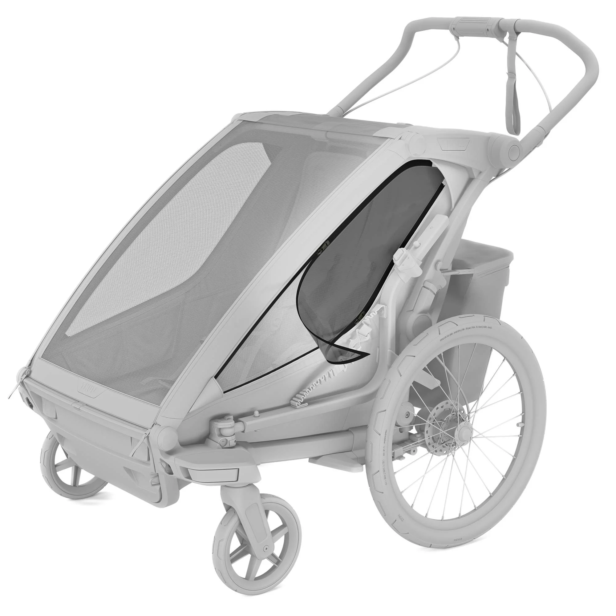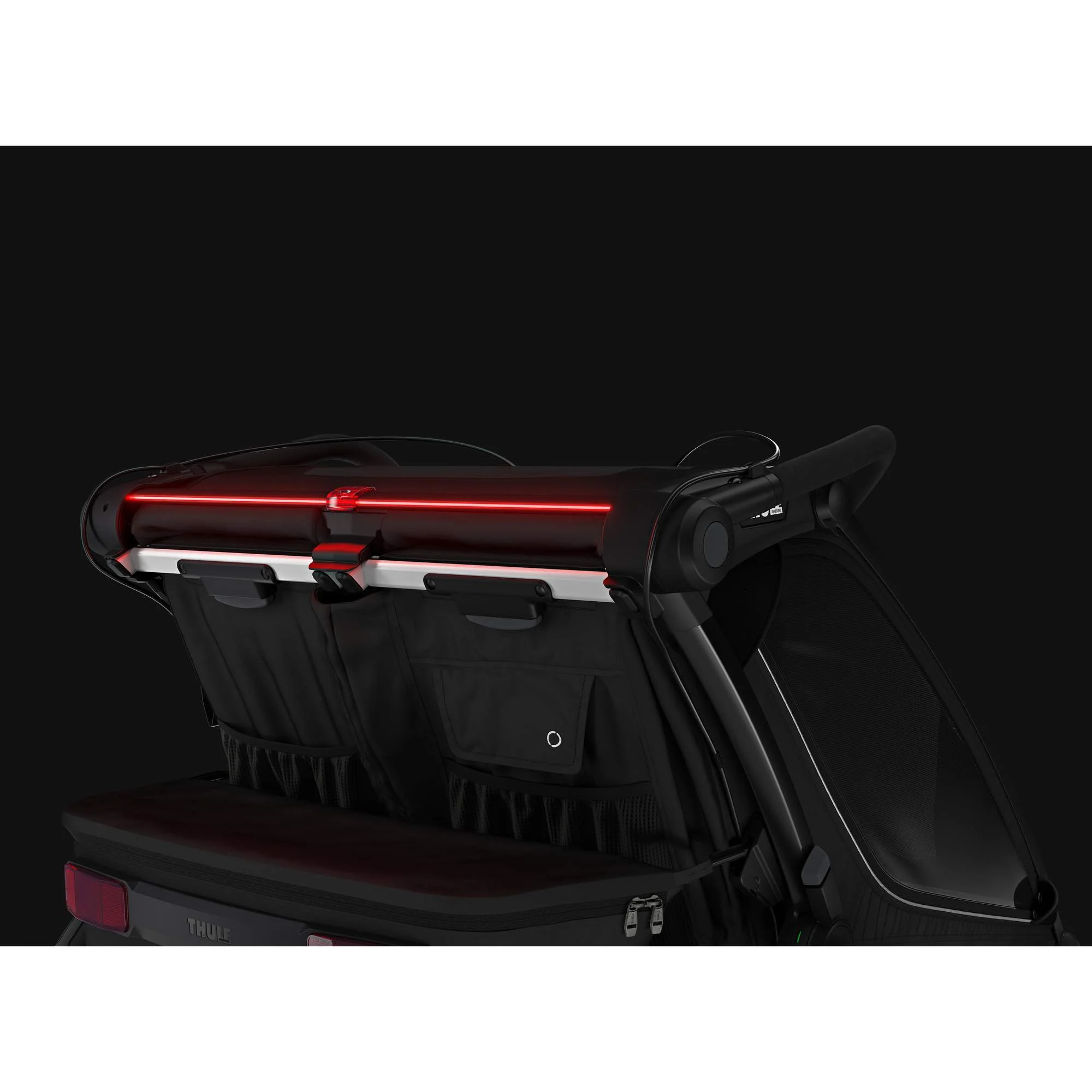 Handbetätigte Scheibenbremse, Schwenkbare Vorderräder (Buggyfunktion), Click-In Deichsel, Überrollbügel, LED-Rücklicht über gesamte Breite, Abnehmbares Verdeck, Sonnenblende, Lüftungsöffnungen |