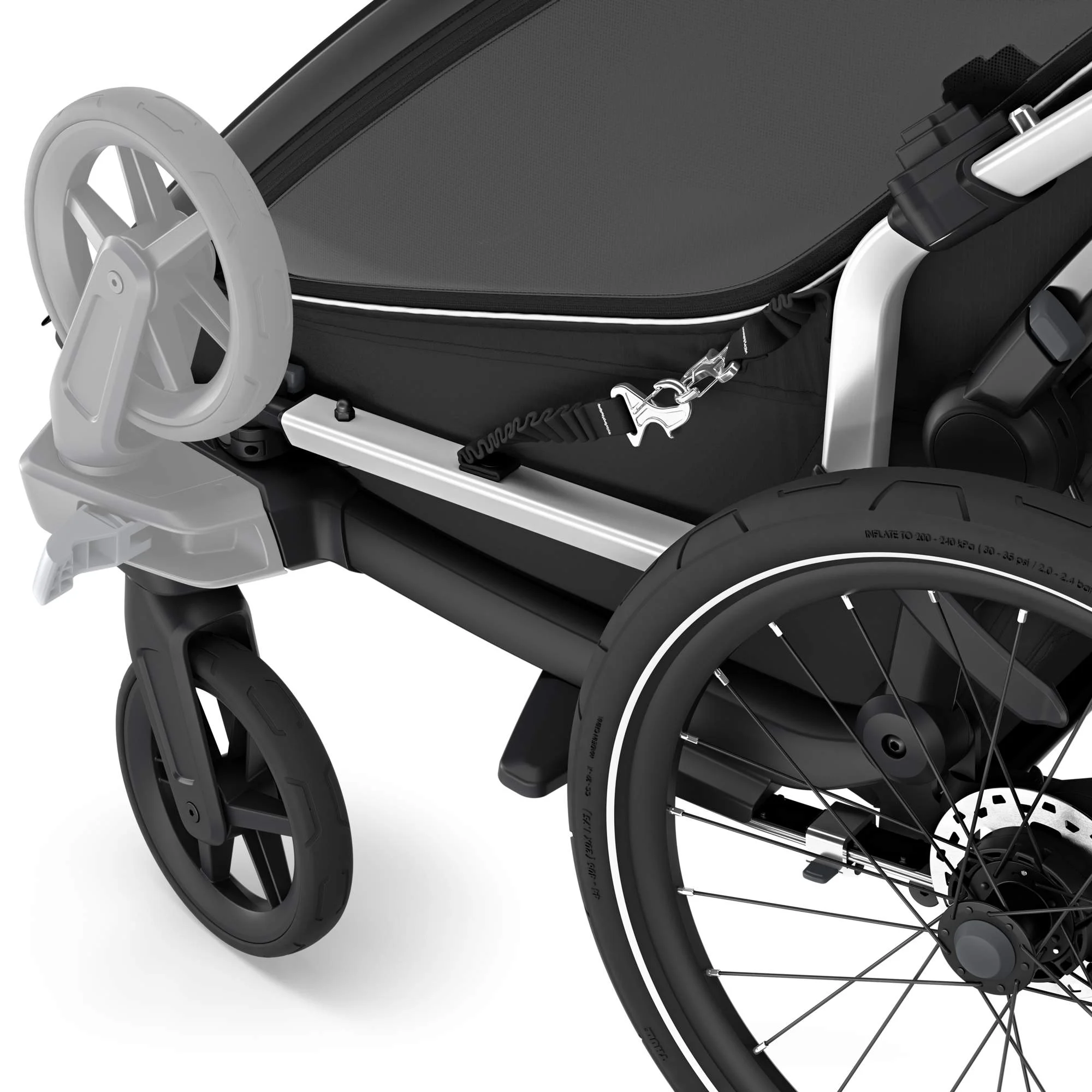 Highlights: Geländetauglich dank Scheibenbremse, flexible Nutzung als Buggy oder Anhänger, verstellbare Liegesitze, schwenkbare Vorderräder für schnellen Funktionswechsel, großes Staufach, optimierte Belüftung, PFC-freie Materialien.