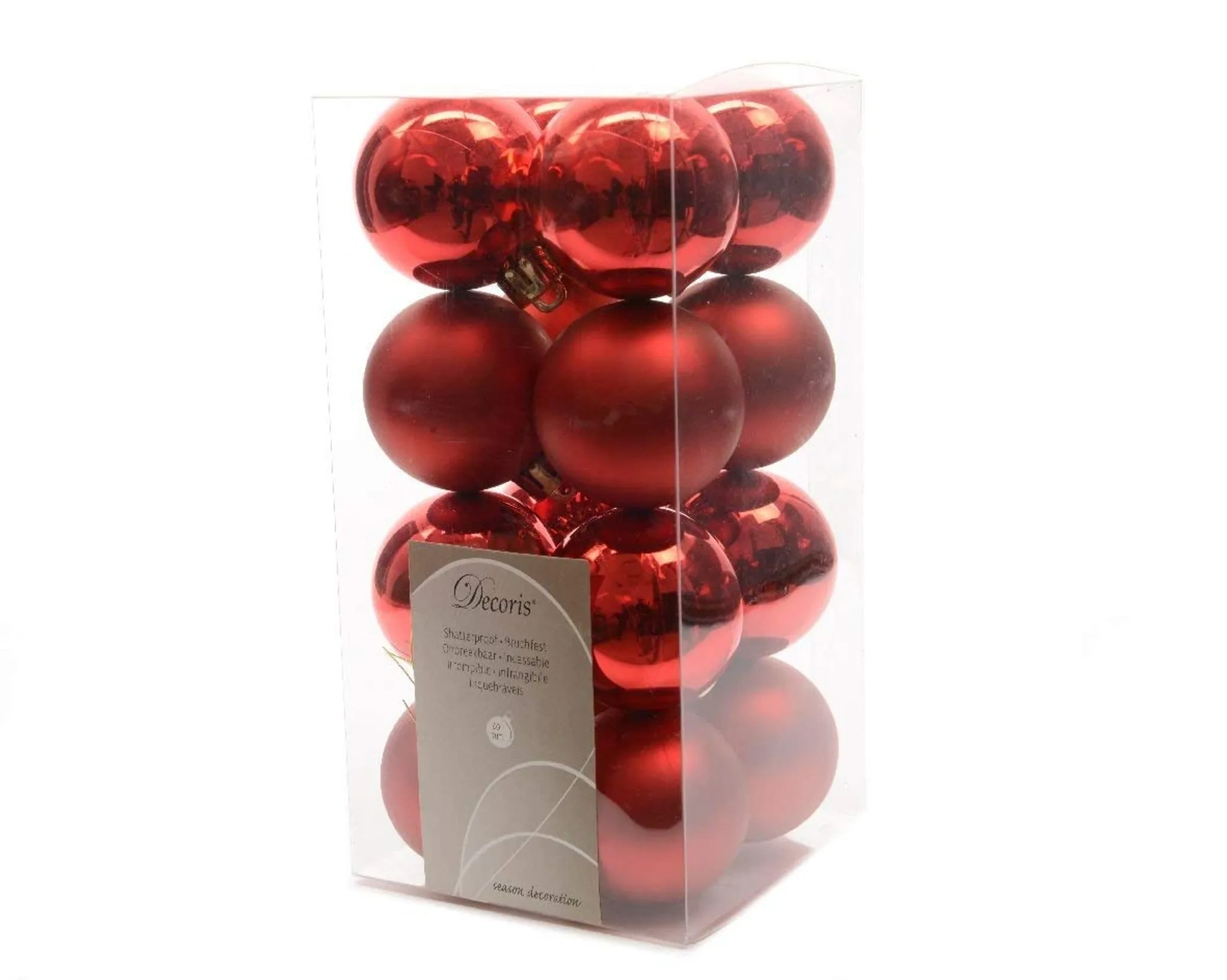 Mit diesem Set aus 16 roten Weihnachtskugeln bringen Sie festlichen Glanz in Ihr Zuhause. Die bruchsicheren Kugeln aus robustem Kunststoff sind ideal für Haushalte mit Kindern und Haustieren geeignet. Das Set kombiniert 8 matte und 8 glänzende Kugeln in klassischem Weihnachtsrot – perfekt für eine stilvolle und sichere Weihnachtsdekoration.