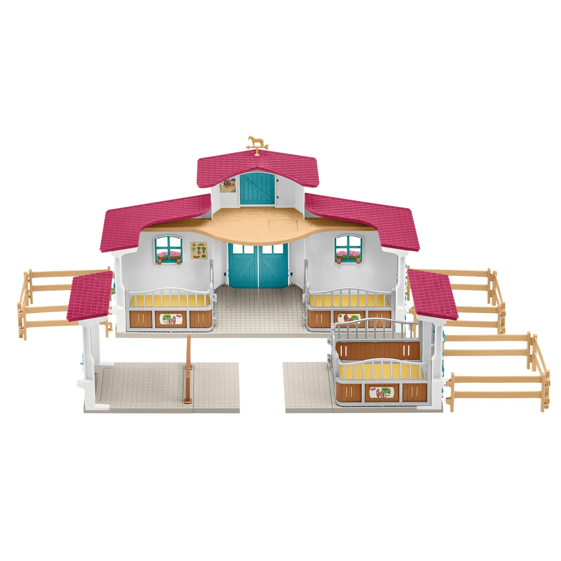 Highlights: Vielseitige Stallanlage mit Außengelände • Kombinierbare Zaunelemente • Detailliertes Zubehör für Pferdepflege & Reiten • Schlafbereich auf dem Heuboden • Ideal für kreative Rollenspiele.