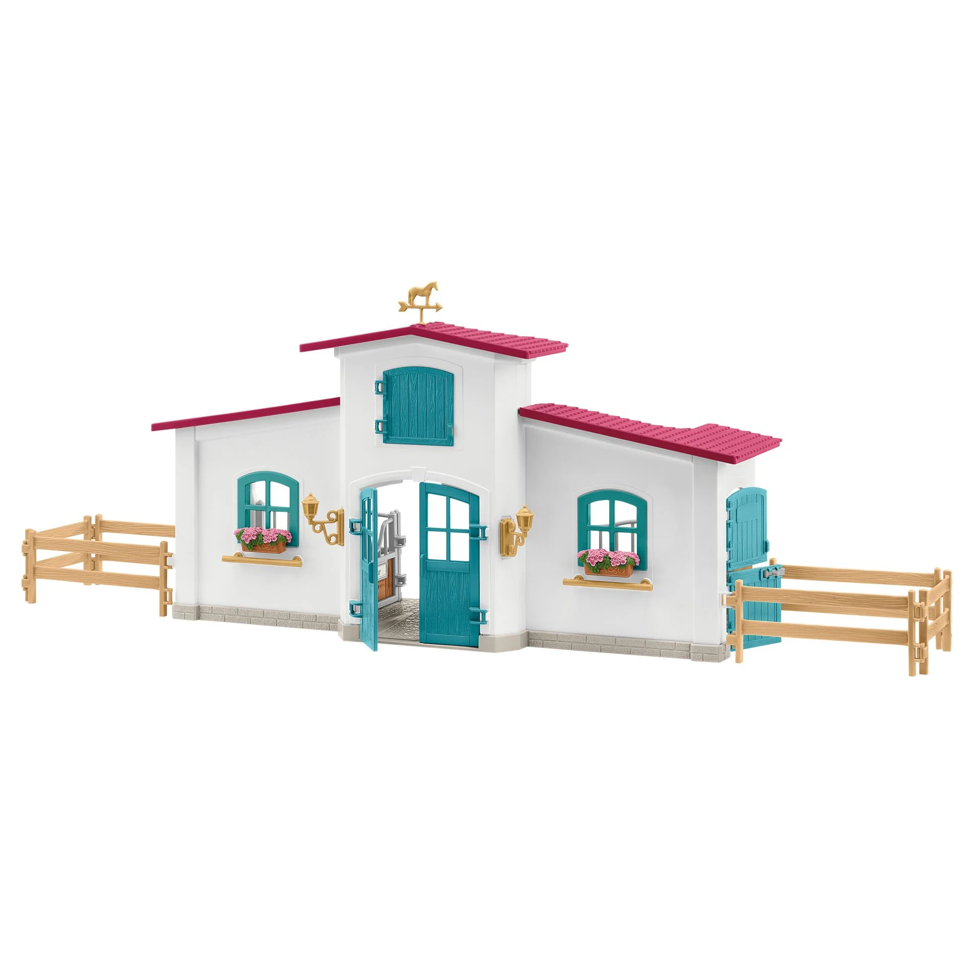 Dieser große Reiterhof von schleich® bietet Pferdeliebhabern eine liebevoll gestaltete Umgebung zum Spielen, Trainieren und Pflegen der Tiere. Der geräumige Stall mit Außengelände ist mit zahlreichen Details ausgestattet – von Boxen mit viel Platz bis zu Raufen, Tränken sowie Haltern für Sattel und Zaumzeug. Mit seinen farbenfrohen Fenstern und Türen wirkt der Hof besonders einladend und lebendig.